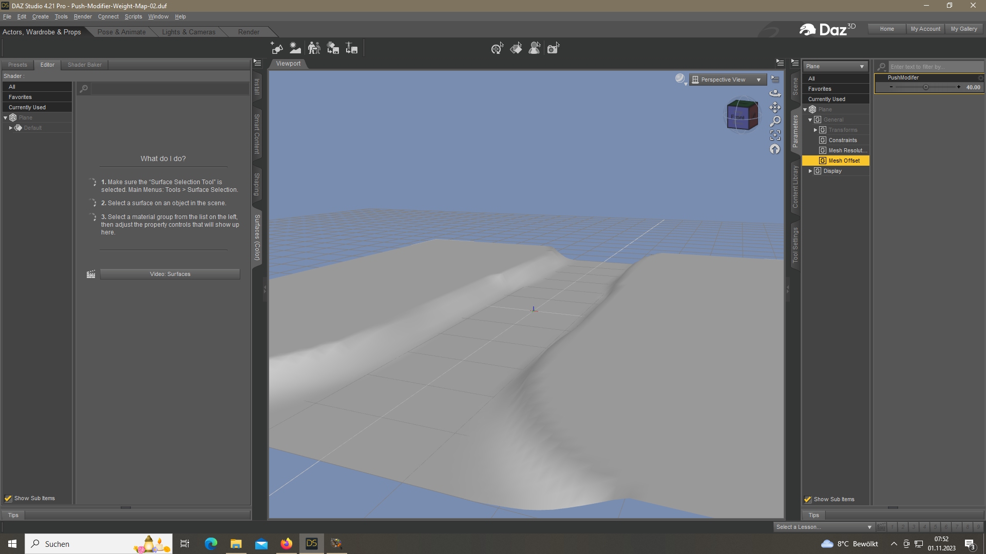 Als erstes nun der Plane einen Push Modifier zuweisen. Da dessen Voreinstellung bei 1 liegt, schlägt er sofort zu, wodurch das vorhandene Raster vom Studio nicht mehr zu sehen ist, was ich weniger gut fand.