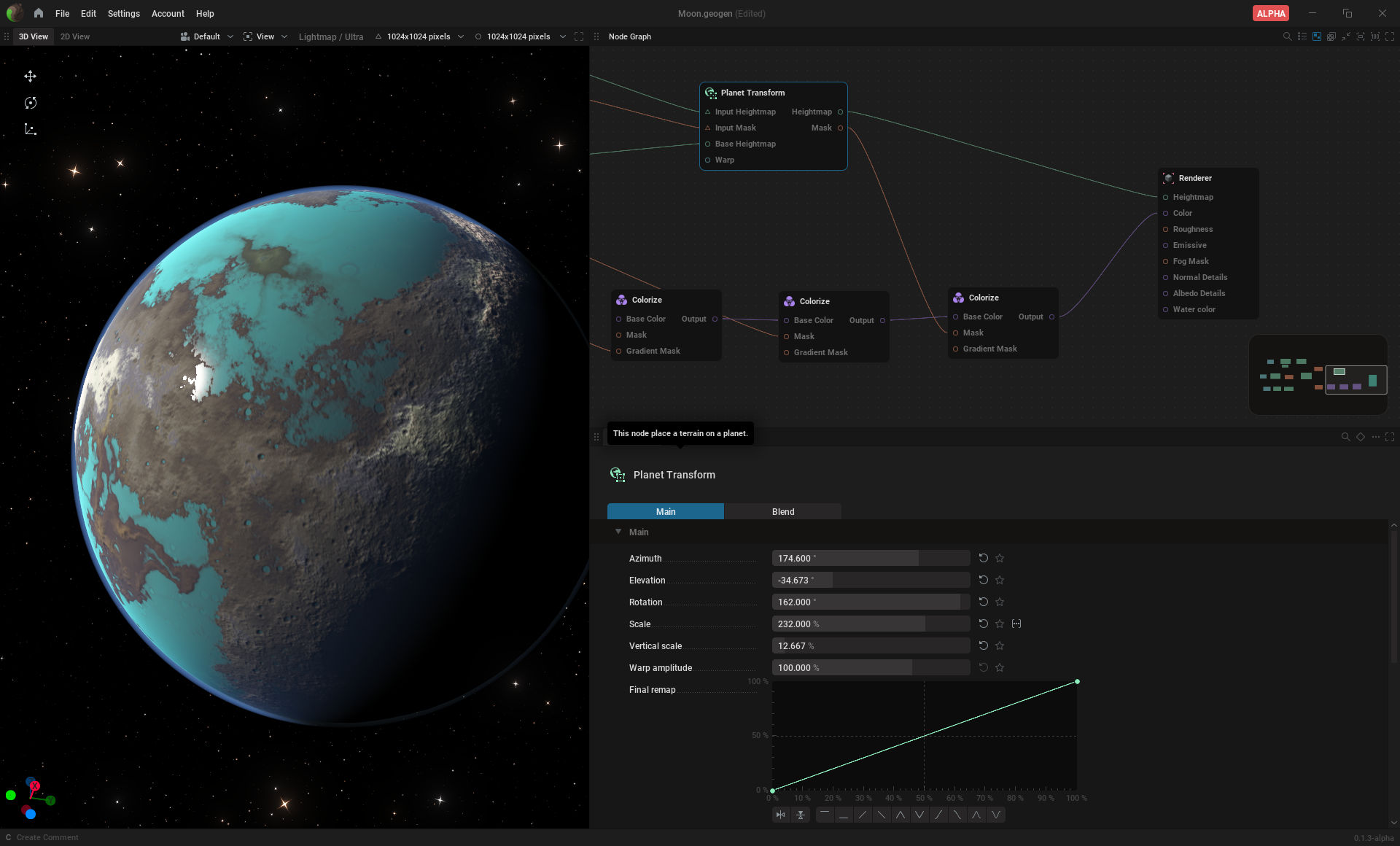 Im Gegensatz zu anderen Landschaftsgeneratoren, wie z.B. dem von mir geliebten World-Creator, bietet GeoGen auch die Möglichkeit, ganze Planeten zu gestalten, optimal für Backgrounds in SciFi Szenen.