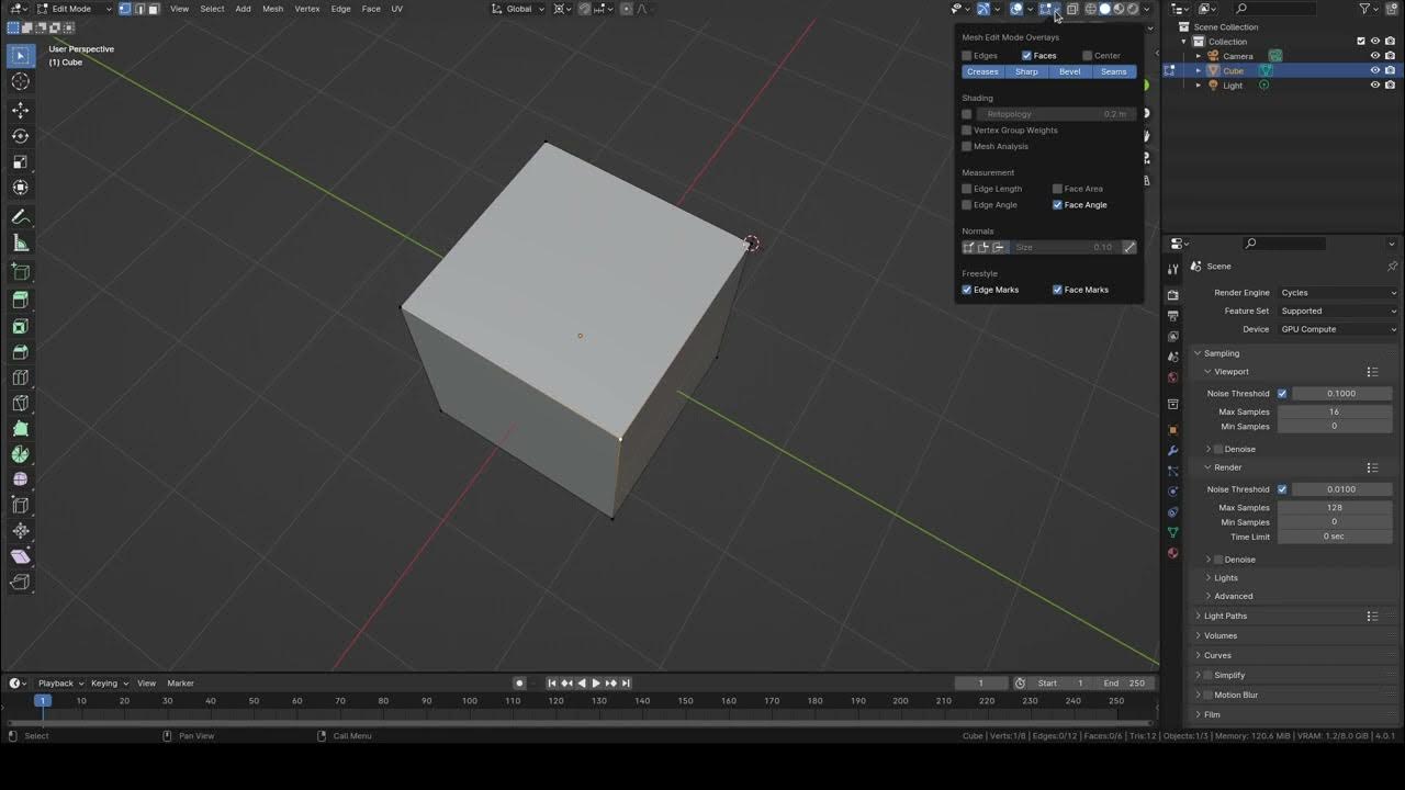 Wenn man Edge Angle anhakt, wird der Winkel zwischen den Faces, die an der jeweiligen Edge zusammenkommen, angezeigt.