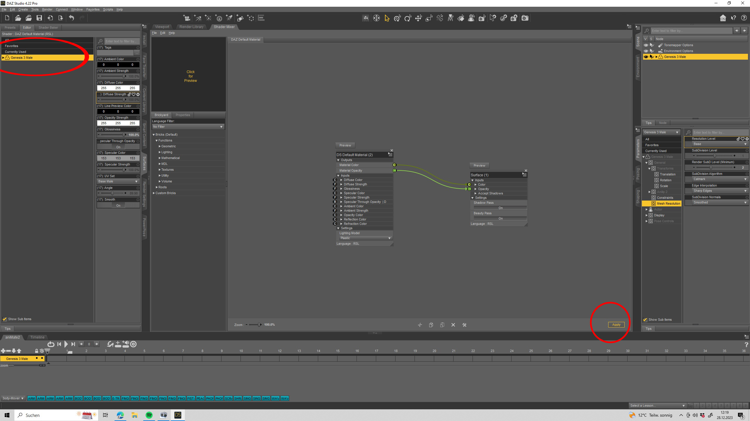 Dann gehen wir zum Shadermixer und klicken die Figur an in der Surface Tab bis sie gelb erleuchtet.