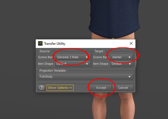 Ein Botton erscheint und das wichtige hier ist, dass der Mantel bei From: (NICHT!) Costume steht, sondern ihr klickt das (Daz Studio (1 unit= 1cm ) an