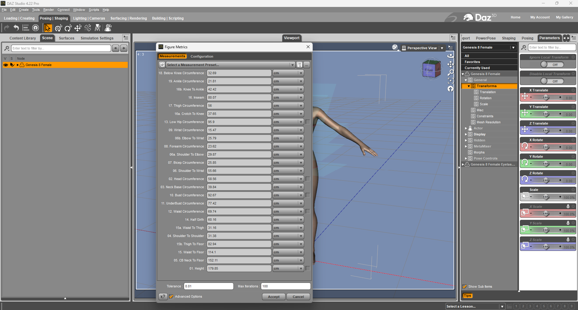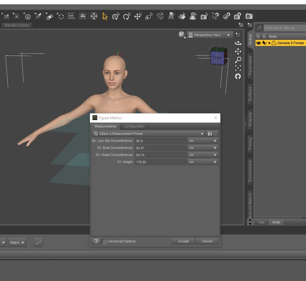 ich habe endlich herausgefunden warum Measure Metrics bei G8F nicht funktioniert hat. Aus irgendeinem Grund war in der Configurationseinstellung "Genesis 8" nicht eingetragen. Nachdem ich dies wieder eingestellt habe, funktioniert es wieder einwandfrei. Vielleicht hilft diese Mitteilung ja jemanden.