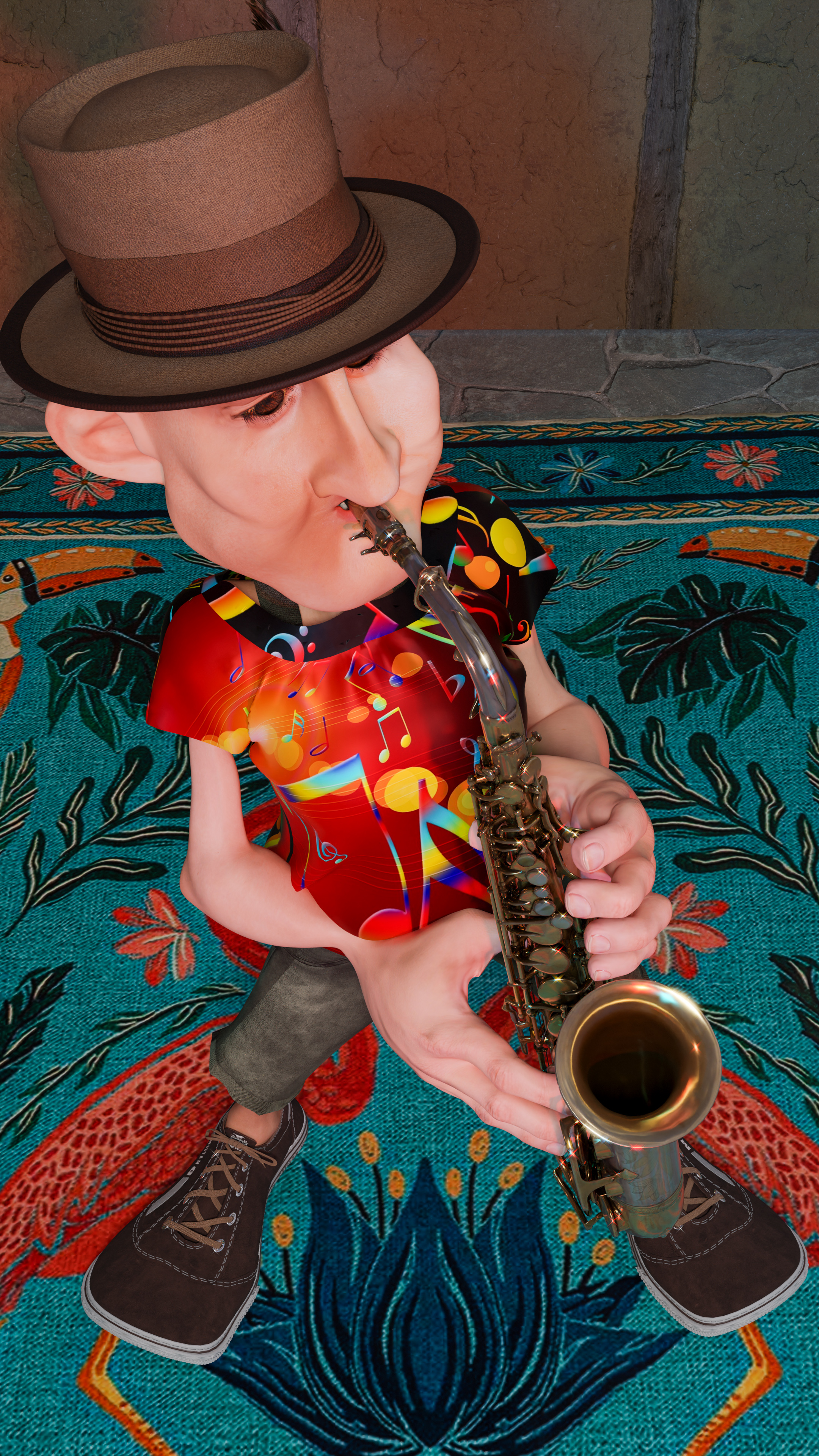 • Ich füge noch einige Bilder hinzu. Es geht um Bertas Schwierigkeiten beim Dicke-Backen-Machen. Insgesamt geht es um die mögliche Körperhaltung beim Saxophonspielen, den mangelnden Daumenkontakt zum Saxophondaumenlagerhaken der rechten Hand und um dieses wunderbare Musikinstrument.