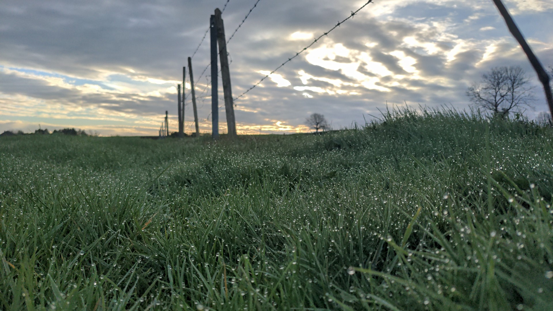 Los ging es kurz nach Sonnenaufgang durch von Tau tropfnasse Wiesen: