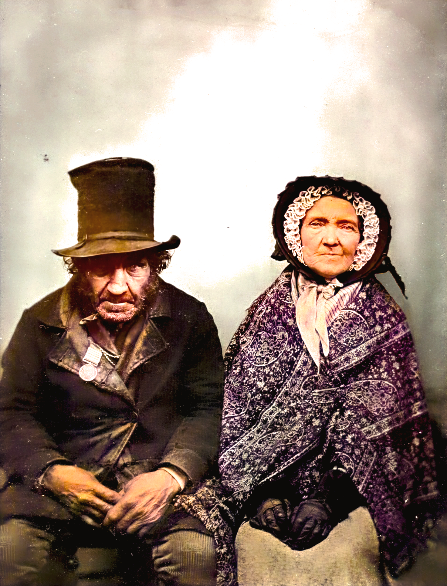 Das Bild zeigt einen Veteranen und seine Frau in einer handkolorierten Ambrotypie, einem fotografischen Verfahren, das im 19. Jahrhundert populär war. Der Mann trägt die britische Militär-Generaldienstmedaille (MGSM), die rückwirkend für verschiedene militärische Aktionen von 1793 bis 1814 verliehen wurde. Jeder Kampf oder jede Kampagne, die von der Medaille abgedeckt wird, wird durch einen Verschluss am Band repräsentiert. Insgesamt wurden 29 Verschlüsse genehmigt, und die maximale Anzahl, die an einen Mann verliehen wurde, betrug fünfzehn.