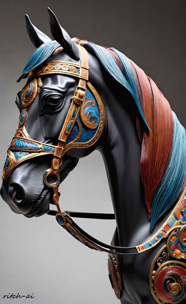 Das Pferd einer Amazone. Hier mit außergewöhnlichem Geschirr und Zügel, welche nur zu besonderen Anlässen angelegt wurden, weil die Kriegerinnen beide Hände zum Spannen des Bogens brauchten und das Pferd mit ihren Schenkeln lenkten.