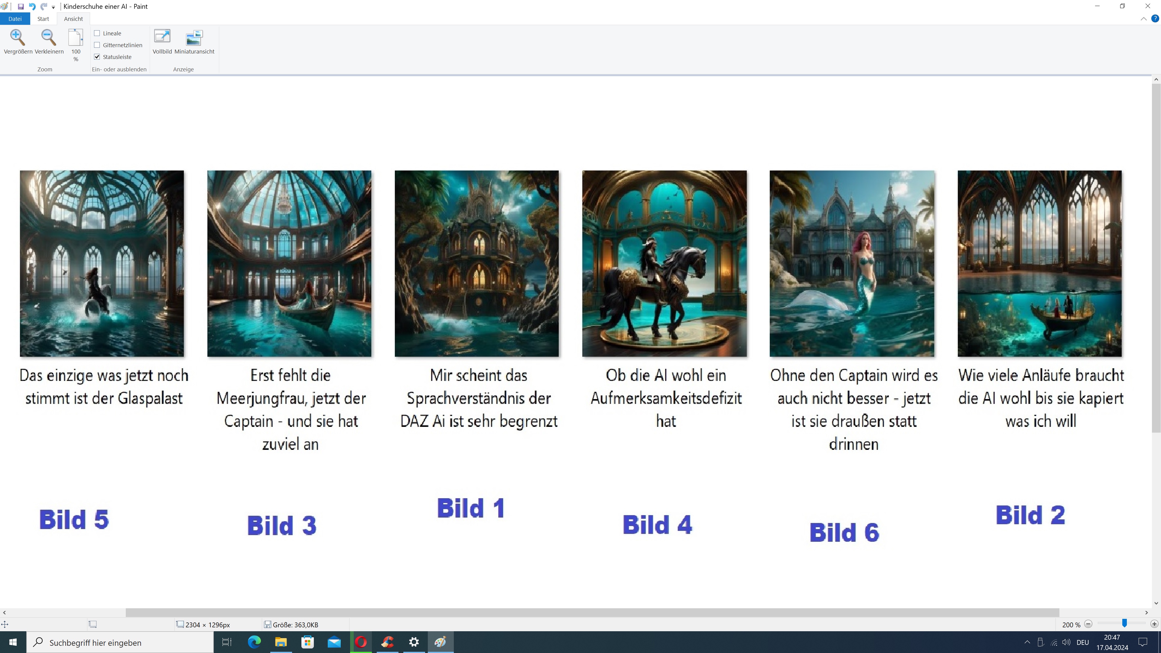 Schlecht waren die Ergebnisse nicht, aber mit meiner Textvorgabe hatten sie nicht sehr viel zu tun. Dementsprechend fielen meine Titel respektive Kommentare aus