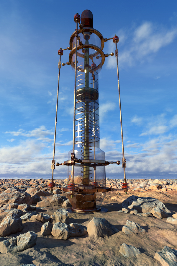 Das Gerät misst 24/7 die Bodenfeuchte und melkt bei Bedarf Wolken, um das Ödland zu begrünen. Einmal installiert, funktioniert es EWIG, da es keine Sollbruchstellen besitzt.