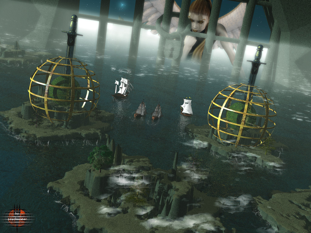 Ich finde das paßt irgendwie nicht: Entweder das Tor ist imaginär: Dann sollte der Horizont überall gleich sein (=>also Torbogen wegmachen und Gitter über den ganzen Horizont vergrößern) - oder das Tor ist nicht imaginär - dann sollte es aber auch nicht halbdurchsichtig sein und das Wasser sollte um den Torbogen und die Gitterstäbe aufbrauschen.