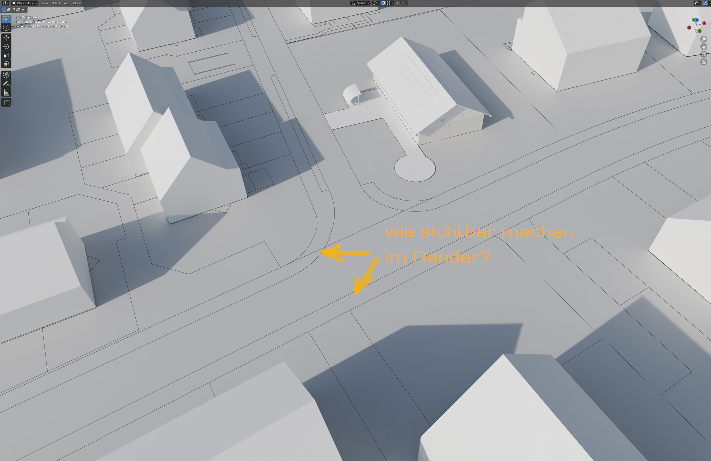 Trotzdem bleibt die Frage: Kann man in Cycles beim normalen Rendern überhaupt den Wireframe einzelner Objekte sichtbar machen.... resp. wie in diesem Fall ein Mesh ohne Flächen, also die importierten DXF Katasterlinien, schwarz darstellen?