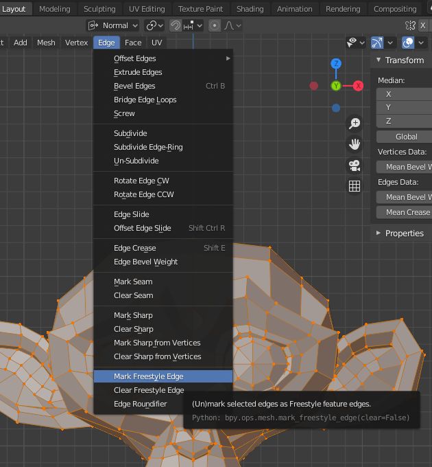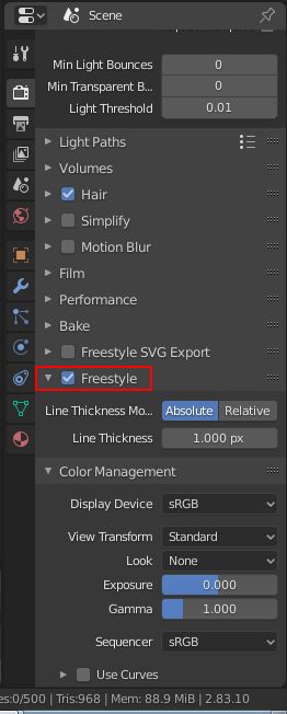 Die Edges werden dann grün. Dann wählt man in den Renderproperties (wo man auch einstellt, ob man mit EEVEE oder Cycles rendern will) ganz unten den Punkt Freestyle aus.