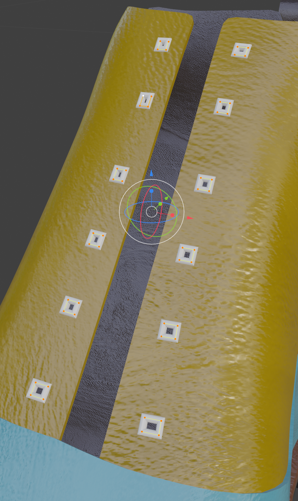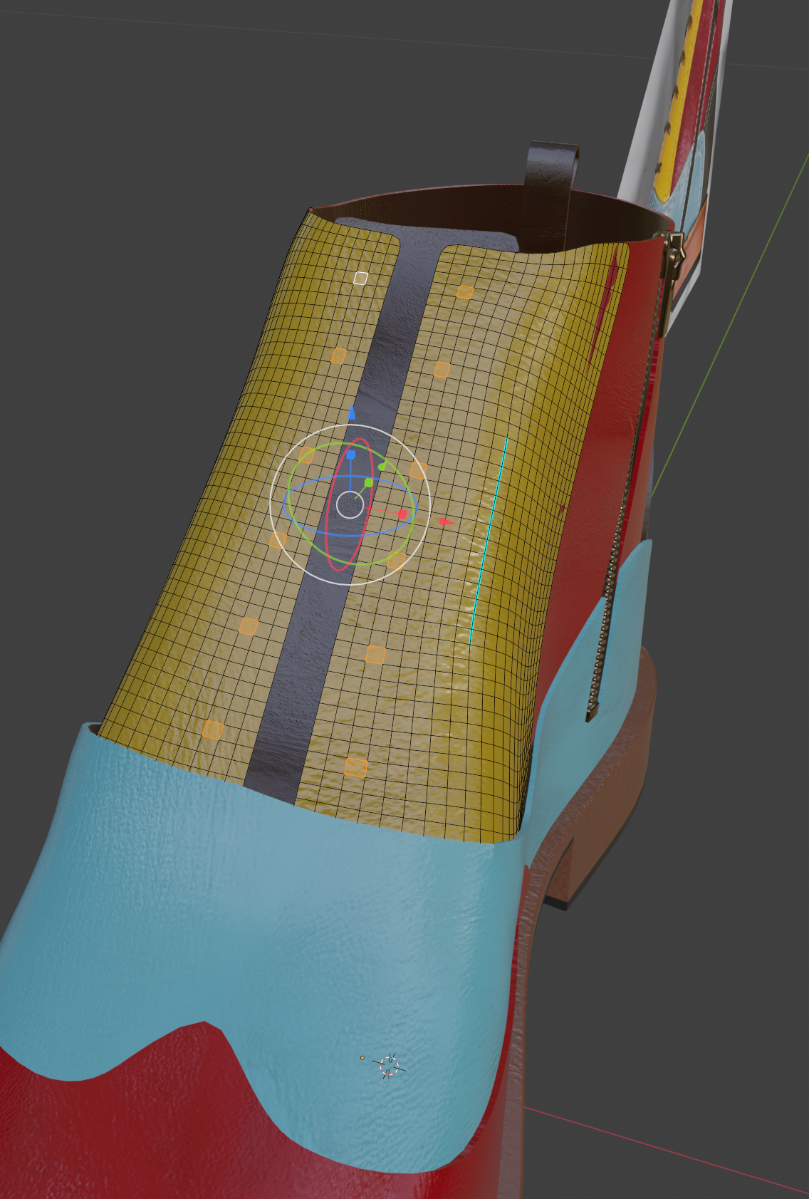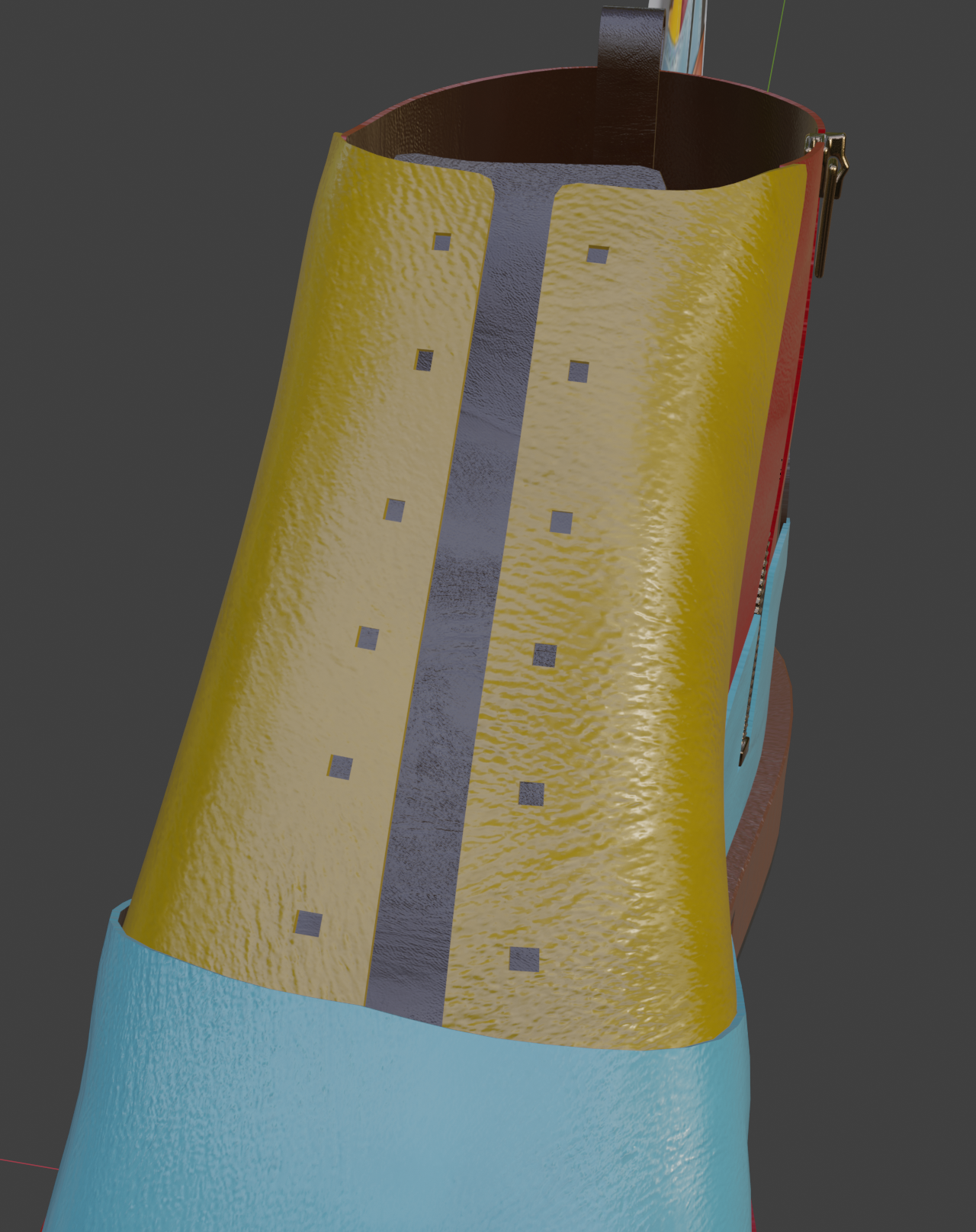 Angefangen habe ich, wie einige schon wissen, mit einem selbst gebastelten Basemesh. Nun habe ich die passenden Zuschnitte gemacht, erneut Retopologie angewendet und ein bisschen Solidify, weil das Leder ja eine Dicke hat und überlappend vernäht wird.