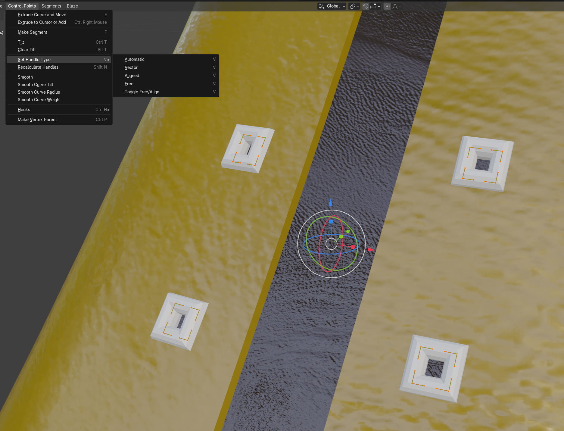 Jetzt habe ich die Ausgangs-Kurven-Vertices der Schleifen doch noch verbunden, diese dann auf Automatik-Hebel geändert, vierfach unterteilt und das mittlere Segment entfernt. Die jetzt entstandenen Enden sollen später die Enden der Schleife werden.