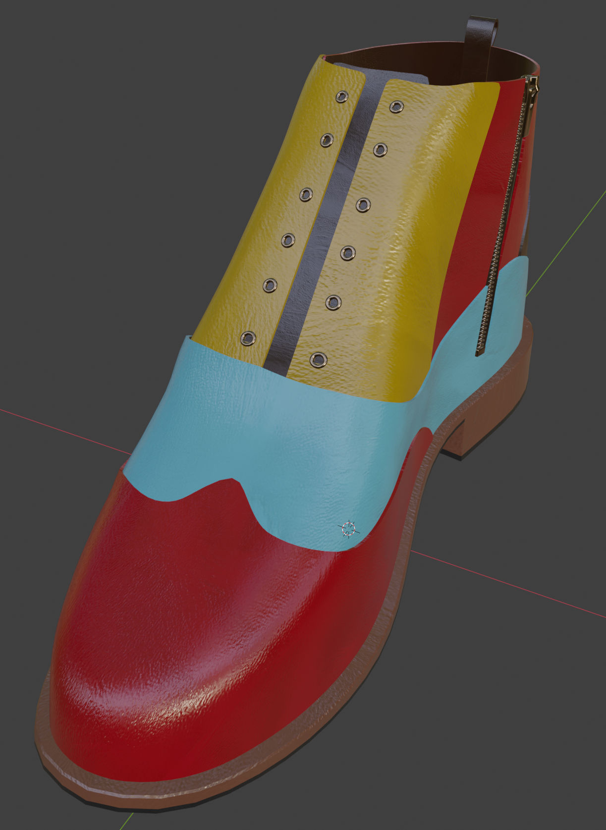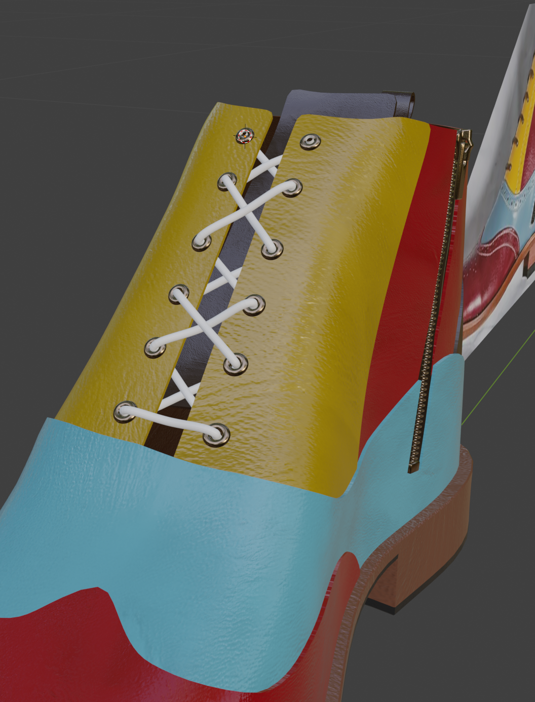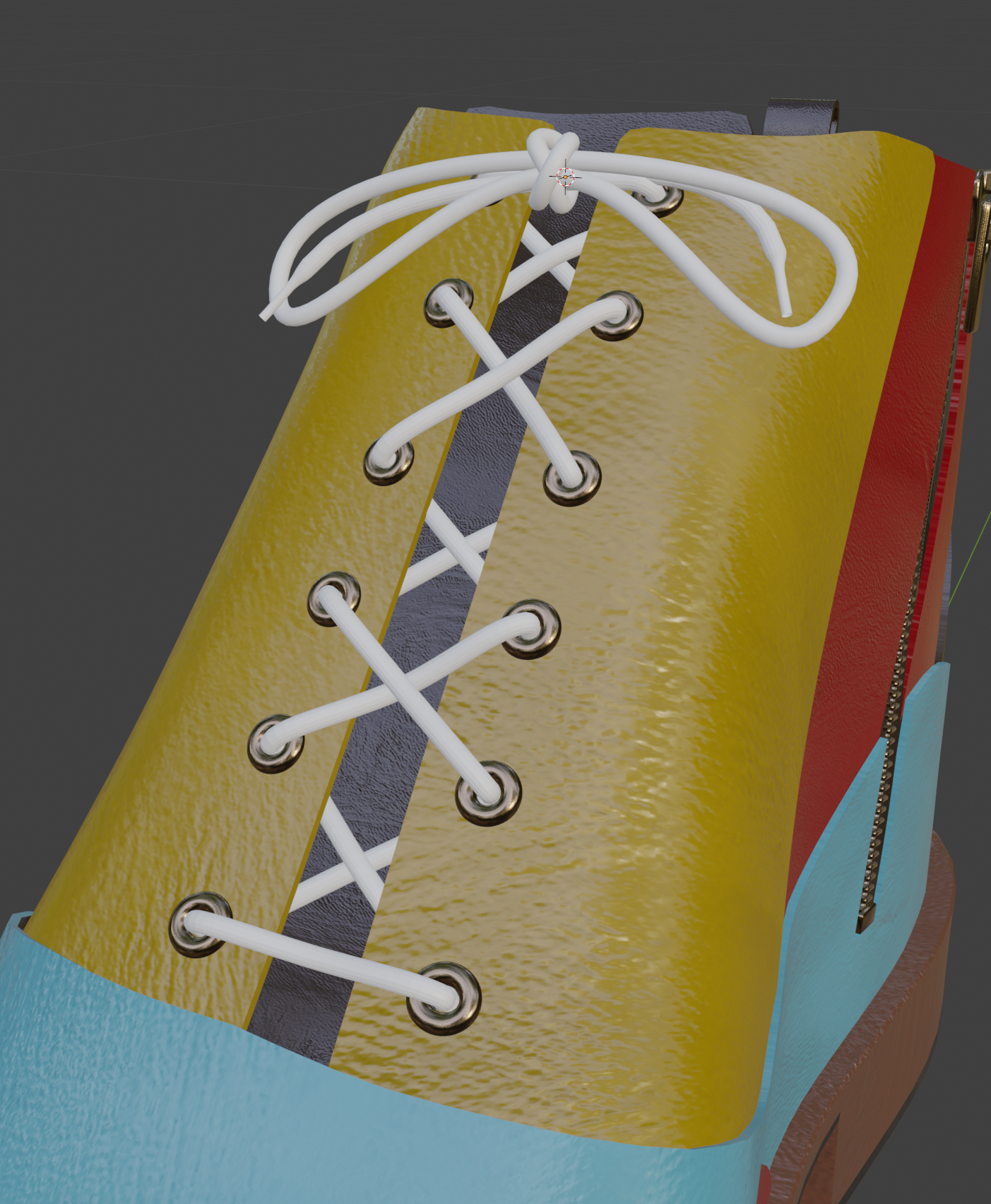 P.S. Ich sehe, dass es kleine Unregelmäßigkeiten in der Verteilung der Löcher und dem Umfang der Ösen gibt. Das liegt an meinem lässigen Umgang mit der Retopologie. Aber das ist das Gute! Es ist genau wie im echten Leben: Nichts ist wirklich gerade, und so hilft es sogar, den Eindruck eines natürlich in der Fabrik oder beim Schuster entstandenen Schuhs zu erwecken.