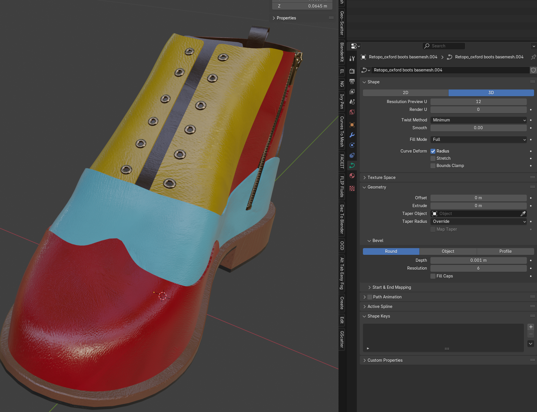 Ich lasse die Ösen noch als Kurve, bis das leidige Einfädeln des Schuhbandes erledigt ist, um eventuell die Ösengröße oder den Kurvendurchmesser anzupassen. Das ist der große Vorteil von Kurven: Sie lassen sich nämlich super bearbeiten. So werden diese erst kurz vor Fertigstellung in Mesh umgewandelt, denn wer weiß, ob es passt.