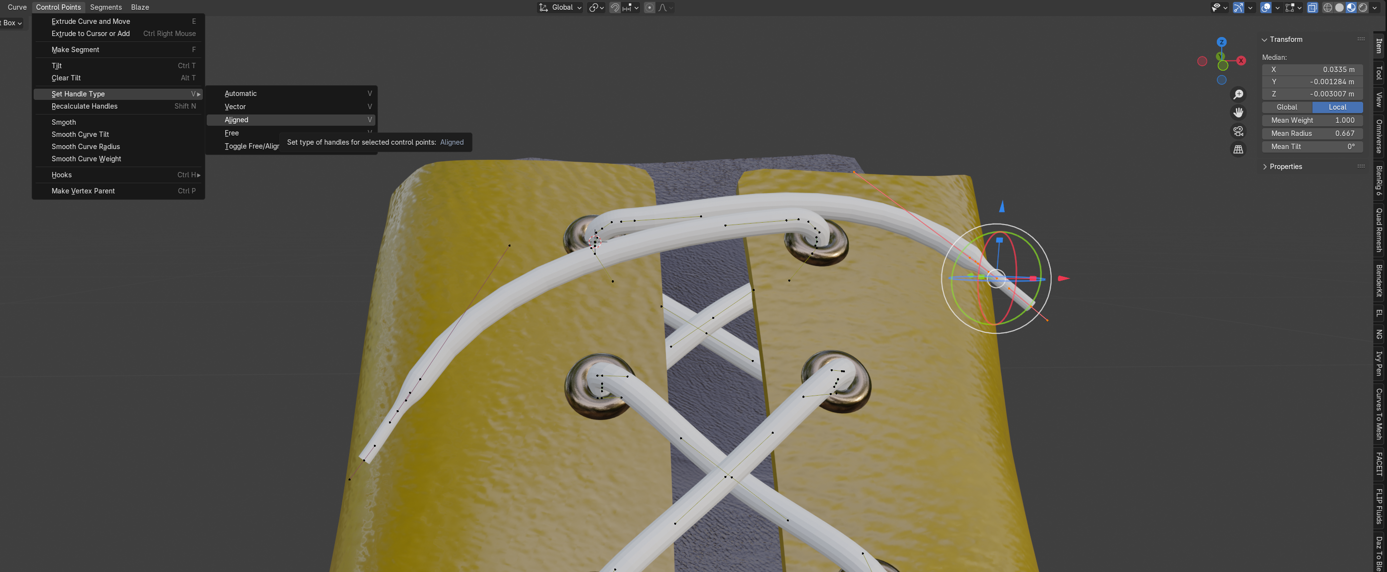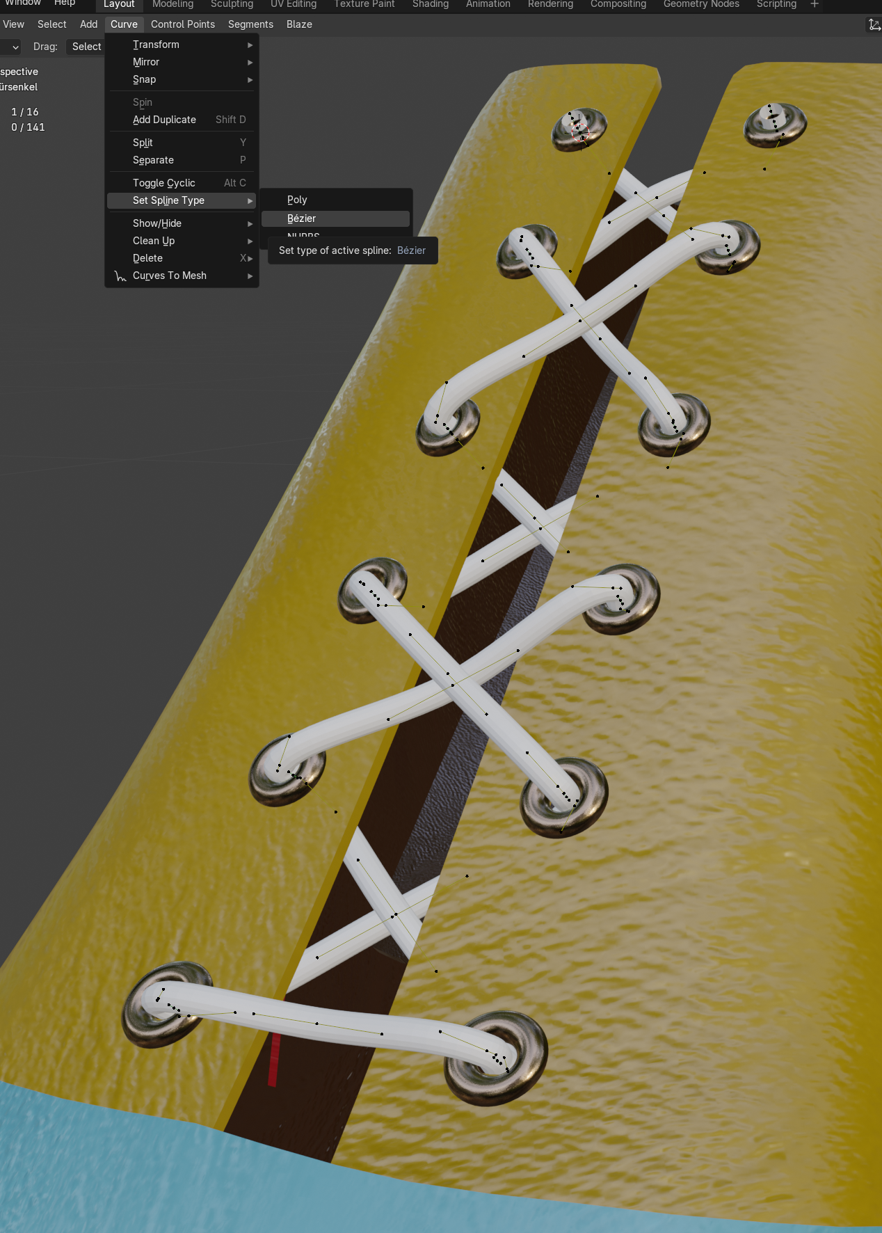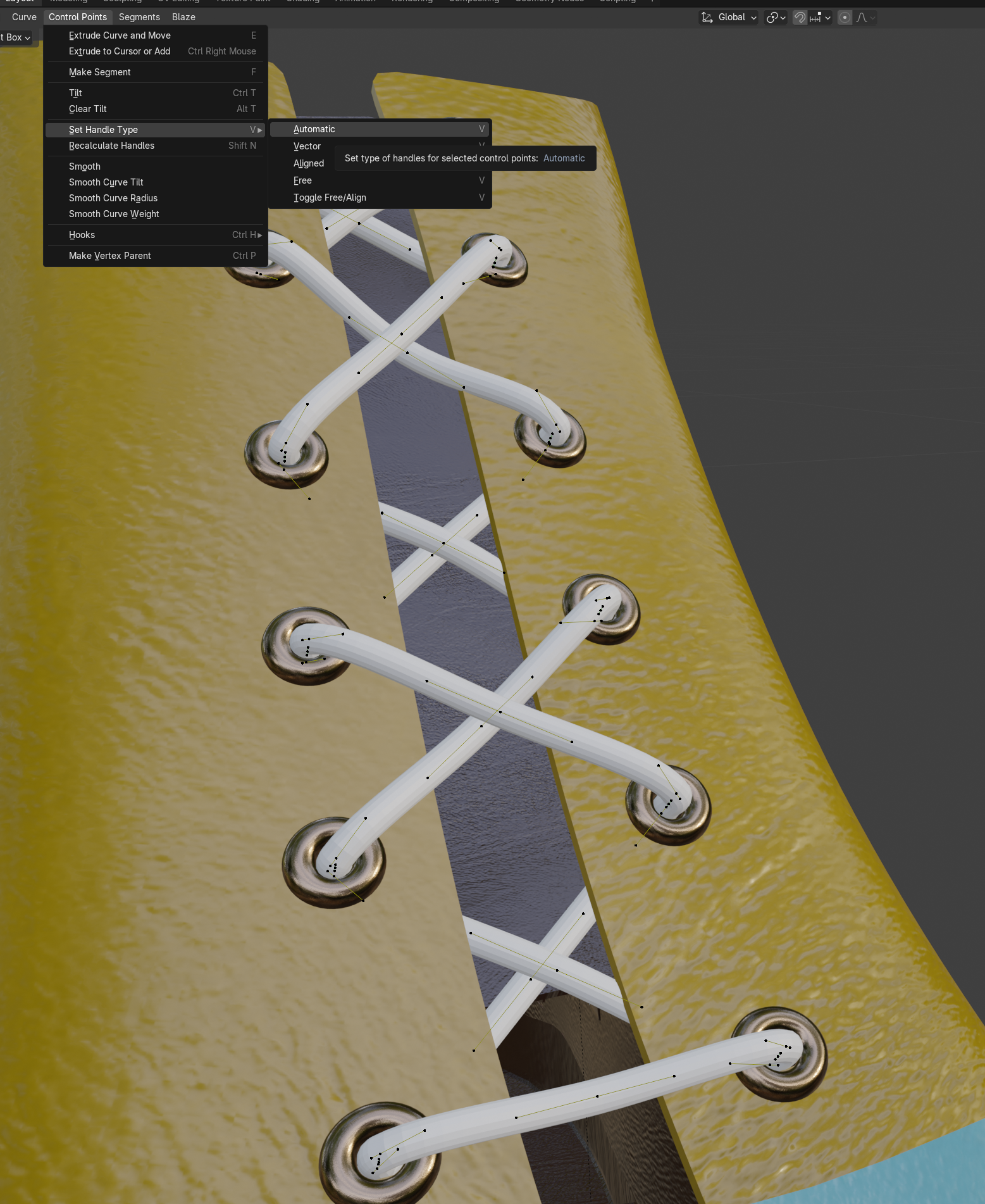 Vorsichtshalber kopiere ich das Schuhband-Mesh, falls etwas schiefgeht, und blende die Kopie im Outliner aus. Dann kann ich dieses Mesh-Schuhband in eine Kurve umwandeln, alle Kurven-Vertices auf Bezier umstellen und bis auf die zentralen in den Ösen liegenden und die Schleifen-Anschluss-Vertices auf Automatik-Hebel umstellen. So, es sieht doch schon mal ganz gut aus, nicht zu gleichförmig, um es natürlich wirken zu lassen. Hier und da an den Hebeln fummeln, bis das Ergebnis befriedigend ist.