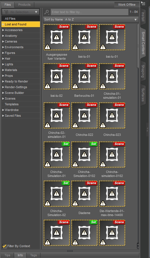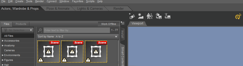 Mittlerweile ist das Fenster mit den Symbolen die keinen Inhalt anzeigen überflutet, da ich die Scenen gelöscht habe. Natürlich kann ich auf die Anzeige der "Saved Files" in diesem Fenster auch verzichten und meine genutzten Scenen unter File: "open" oder" merge" laden, aber warum soll ich das Work Offline Fenster nicht nutzen?