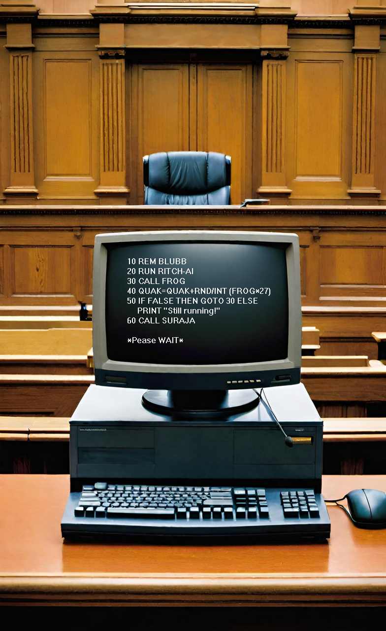 Nach der Kontrolle aller Belange übernahm die KI zugleich die Anklage und Verteidigung ihrer Selbst. Richter und Zuschauer waren überflüssig, da diese sowieso nichts begriffen hätten.