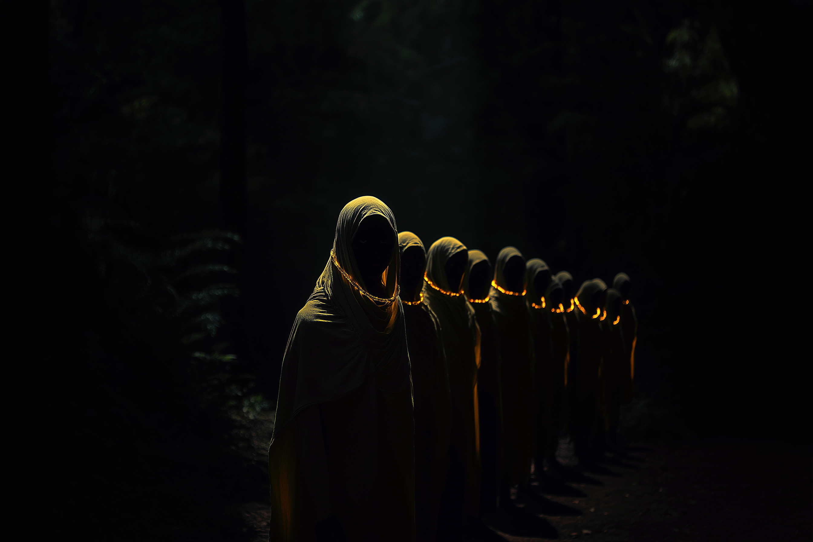 Aus der Dunkelheit heraus traten sie, ein stiller Zug von Gestalten, die nur schemenhaft zu erkennen waren. Ihre Gesichter waren in Schatten gehüllt, doch sie alle trugen das gleiche Symbol – ein goldenes Band, das sich um ihren Hals wand, fein und stark zugleich, ein Zeichen ihrer Verbindung. Es war die Bürde, die sie trugen, die unsichtbaren Fäden, die sie an ihn banden. Und doch schritten sie voran, nicht nur aus der Dunkelheit heraus, sondern auch auf ihn zu...