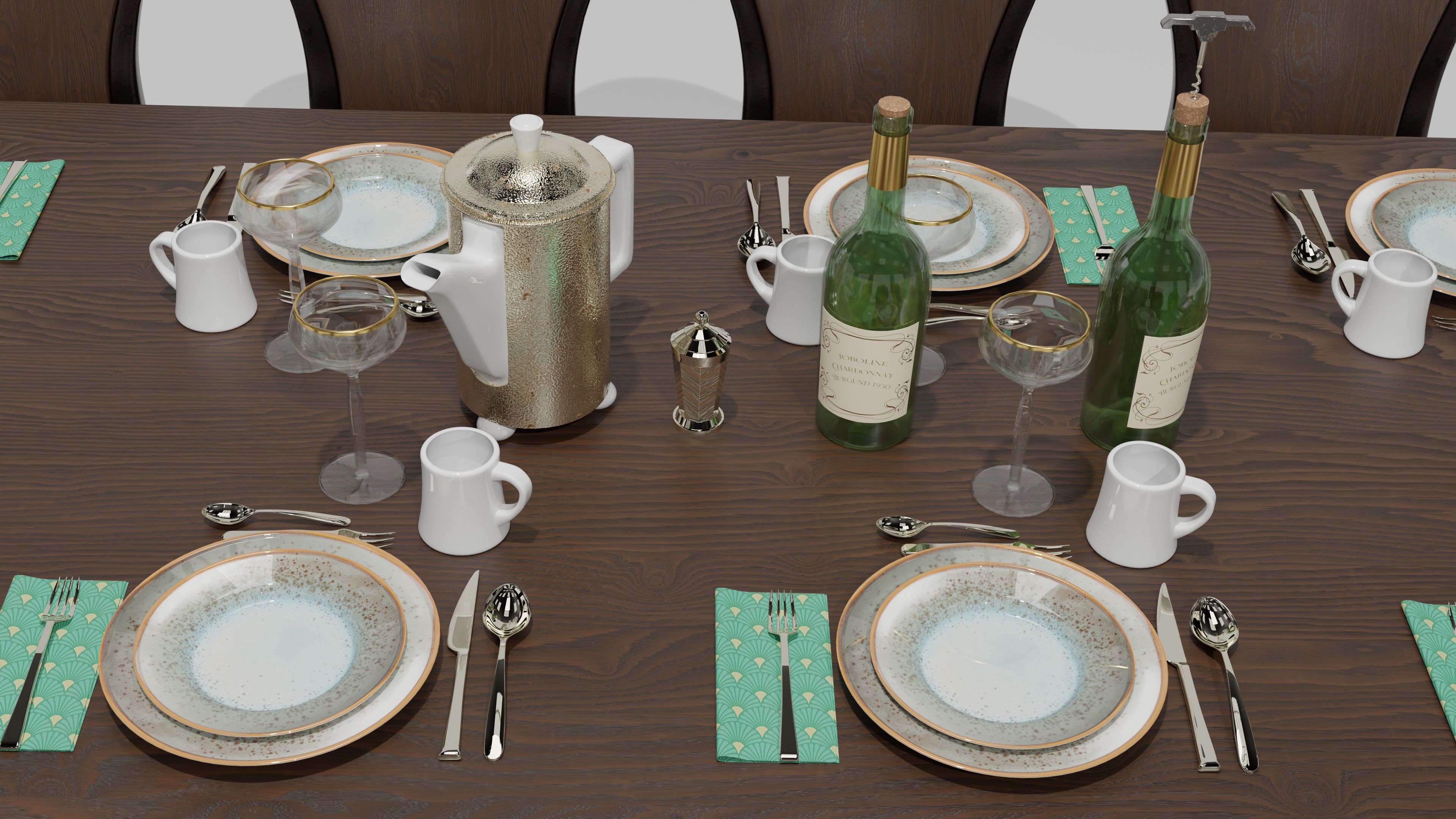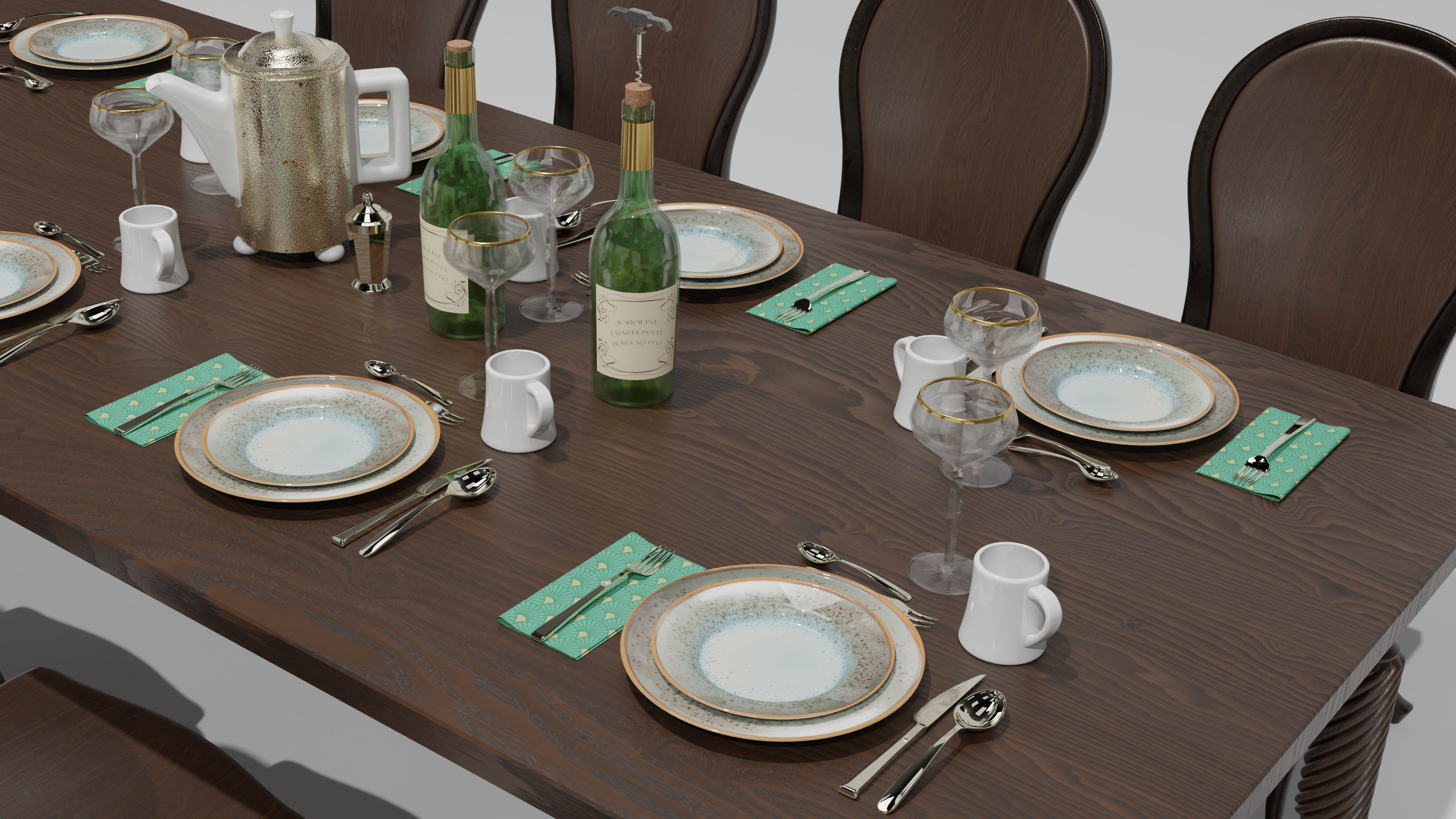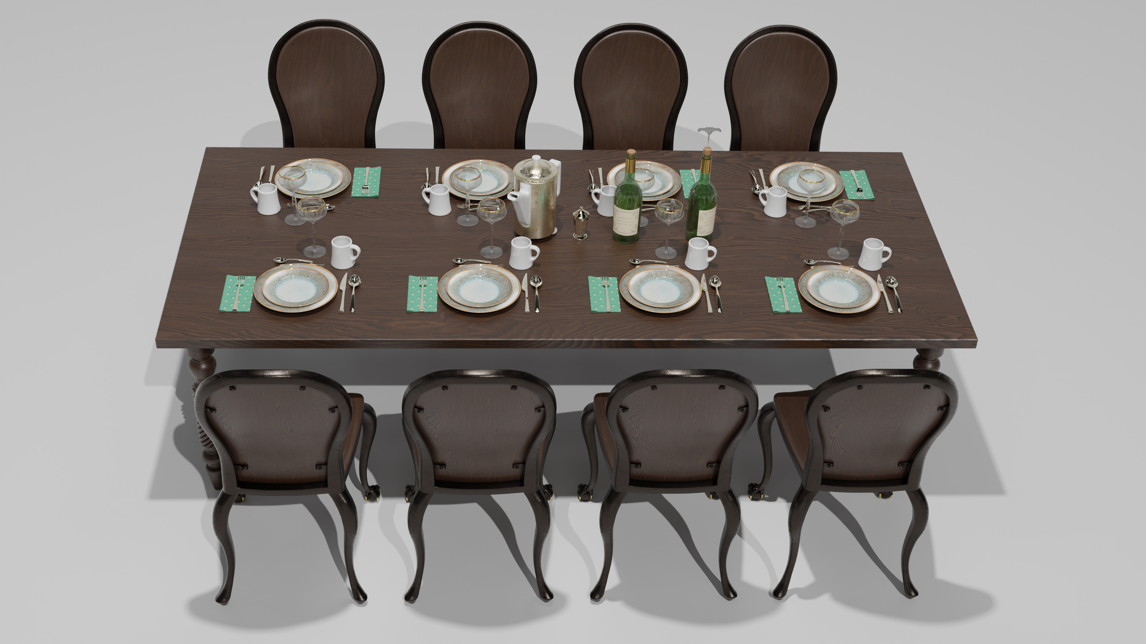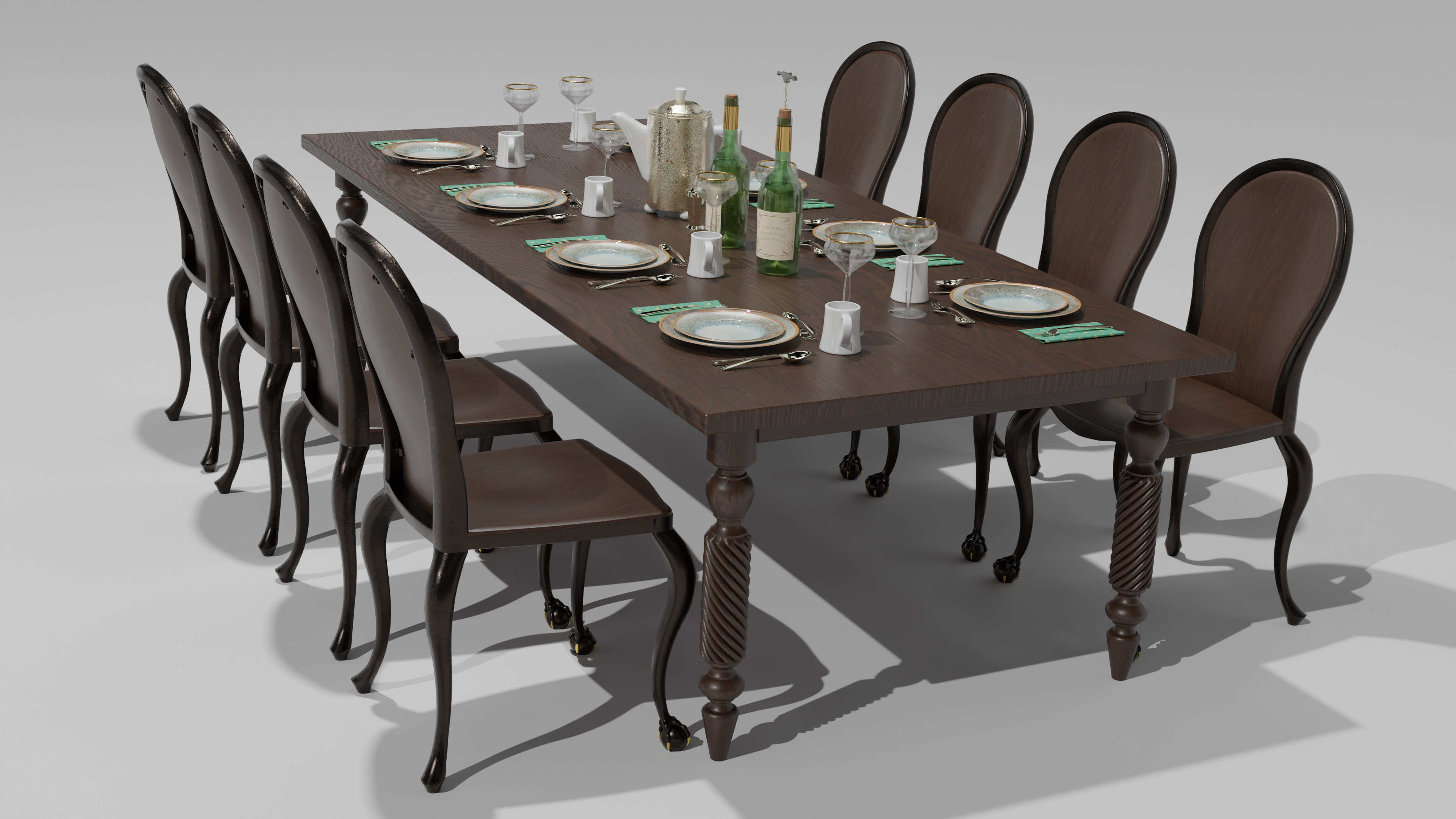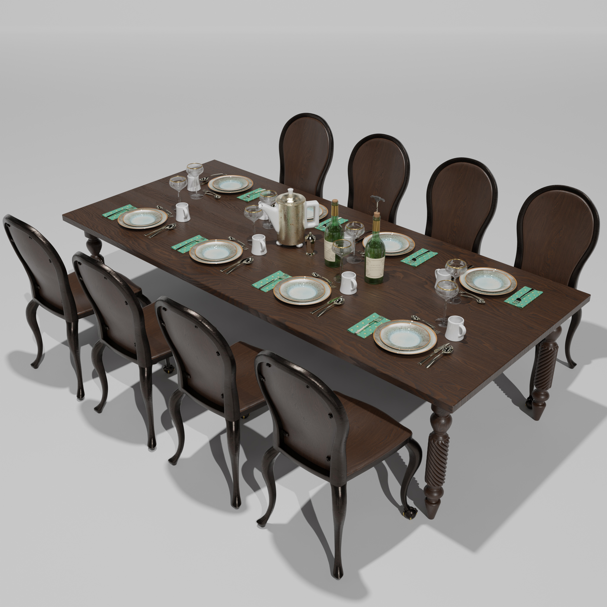 Entdecke das „Majestic Banquet Set für Personen“, ein Blender-Modell, das den Charme und die Eleganz der Art-Deco-Ära einfängt. Dieses exquisite Set umfasst einen großen, dunklen Holzesstisch mit kunstvoll gedrechselten Beinen, liebevoll gedeckt mit Geschirr für acht Personen, einschließlich Vintage-Weinflaschen aus dem Jahr 1930 und frischem Kaffee. Perfektioniere deine Szenen mit diesem detaillierten Modell. Viel Freude beim Arbeiten mit diesem Blender-Modell und viel Erfolg bei deinen Szenen.