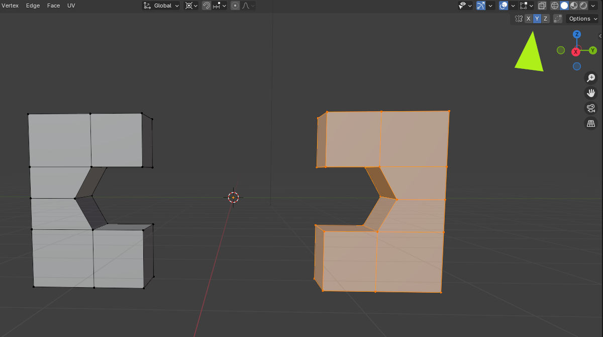 Erst habe ich die linke Figur erstellt, dann im Edit Mode diese kopiert, dann um 180 Grad rotiert und dorthin verschoben.