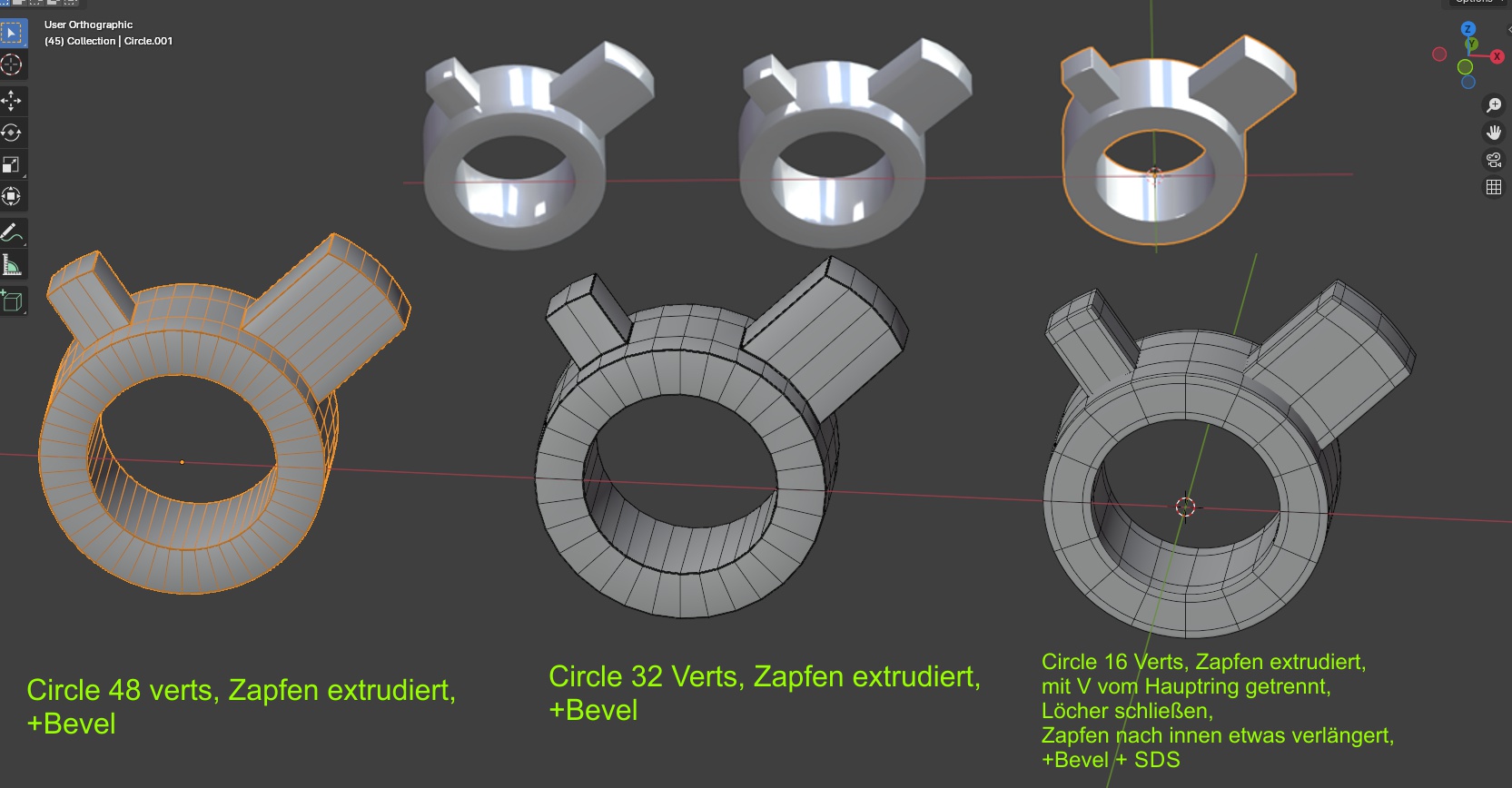 1x aus einem Kreis mit 16 Verts + Extrude, Zapfen getrennt vom Hauptring, Löcher geschlossen, Zapfen nach innen etwas verlängert + Bevel-Mod + SDS-Mod