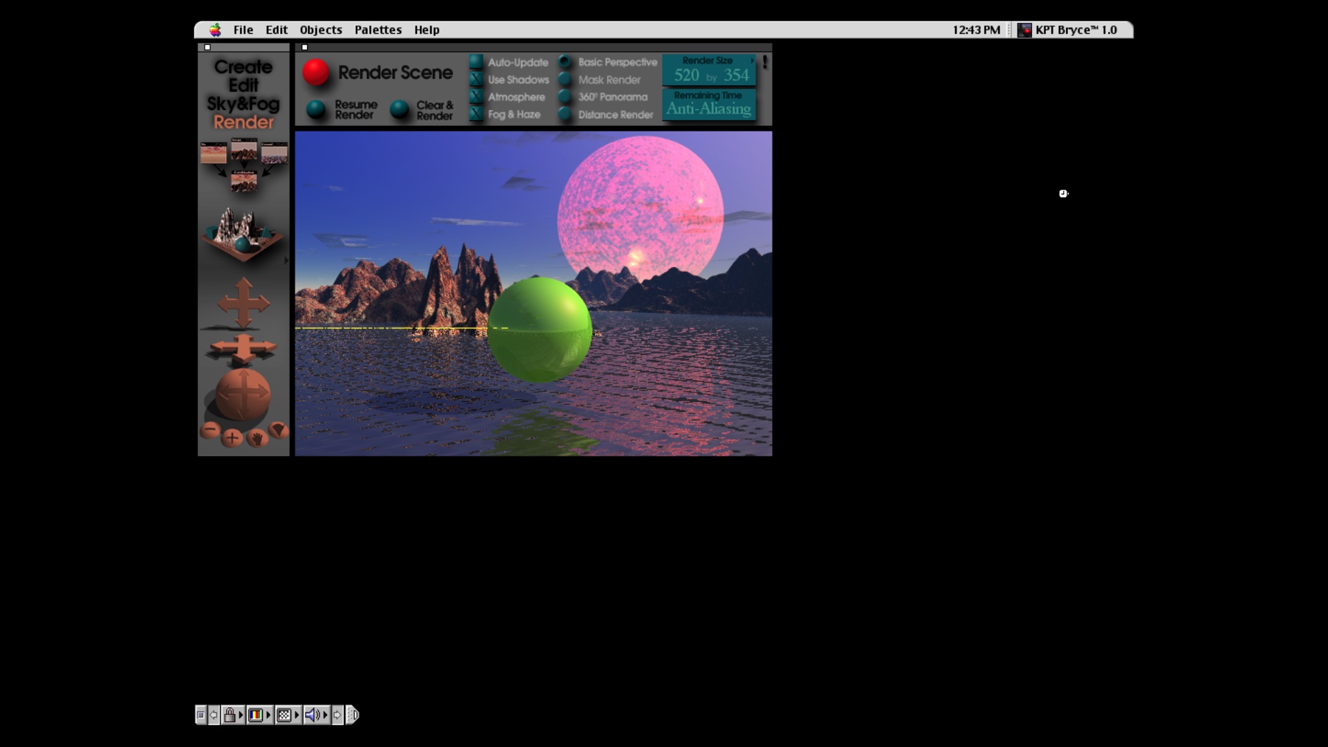 Die legendäre Fjord-Beispielszene aus Bryce 1 ist jedenfalls auch drauf. Die kann man verändern, ganz nach Lust und Laune. Oder in Bryce 1 gleich was von Grund auf Neues zusammenbauen.