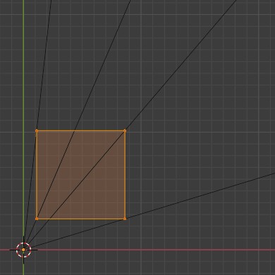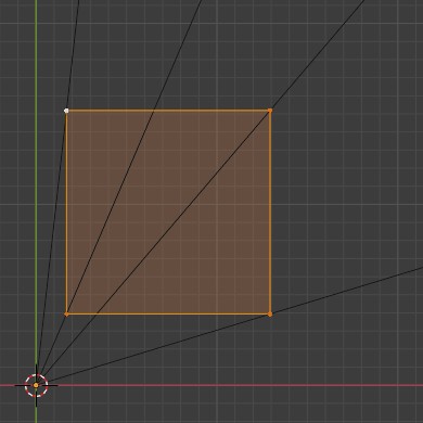 Ausserdem sind da diese schwarzen Linien, die vom Koordinatenursprung jeweils durch einen Vertex der Plane zum Bildrand verlaufen. Wenn wir jetzt den 3d-Cursor, der im Koordinatenursprung liegt, als Pivotpoint einstellen und die Plane skalieren, dann werden die Vertexe der Plane auf genau diesen schwarzen Linien verschoben.
