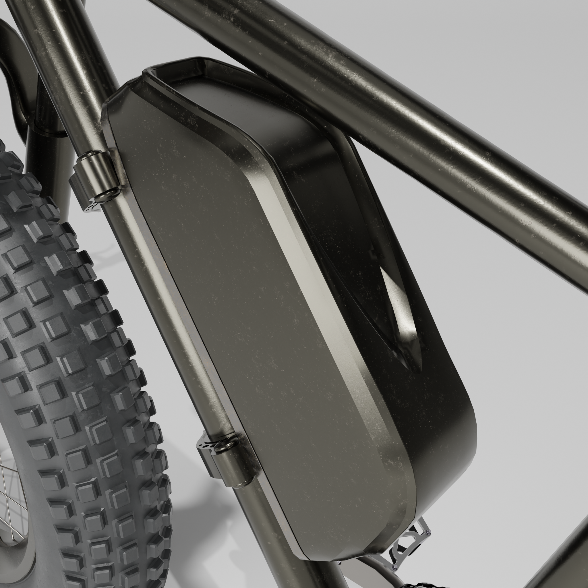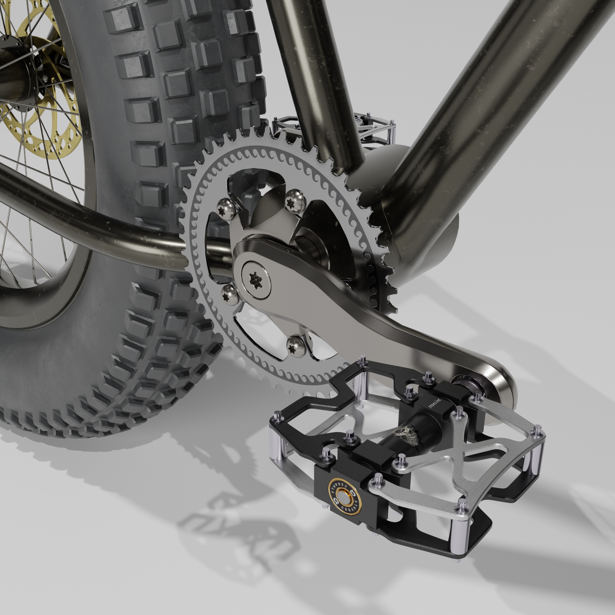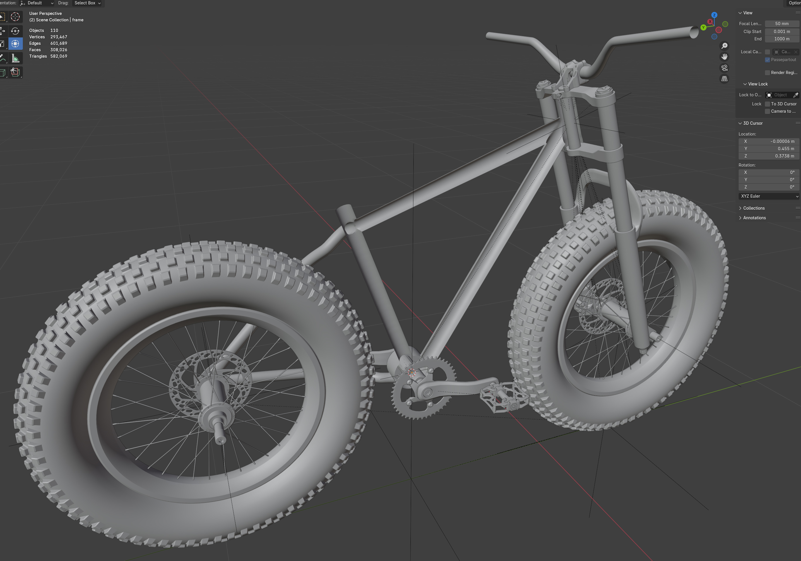 • Ich bin heute ein ganzes Stück weiter gekommen mit dem Blender 4.3 Fatbike "Eisbär". Neue Lenkergriffe, 1000 Watt Motor, der gesamte Antriebsstrang ist fertig geworden inklusive einer neuen Kurbelgarnitur und die Kette und die Räder können durch Kurbelbewegungen in Fahrt gebracht werden. Der Lenker bewegt die Vorderradgabel. Ein neuer 195€ (im echten Leben) teurer Gesundheitssattel war auch noch drin. Außerdem ist der Rahmen so weit fertig inklusive der Radaufhängung und Bremssattelhalterung. Also für heute war das schon richtig viel. Einen Platz für den Akku habe ich noch nicht und Spiegel nebst Anbauteilen fehlt auch noch, genauso wie ein Ständer und Bordcomputer. Aber morgen ist ja auch noch ein Tag. Bis dahin gibt es einige W.I.P. Bilder.