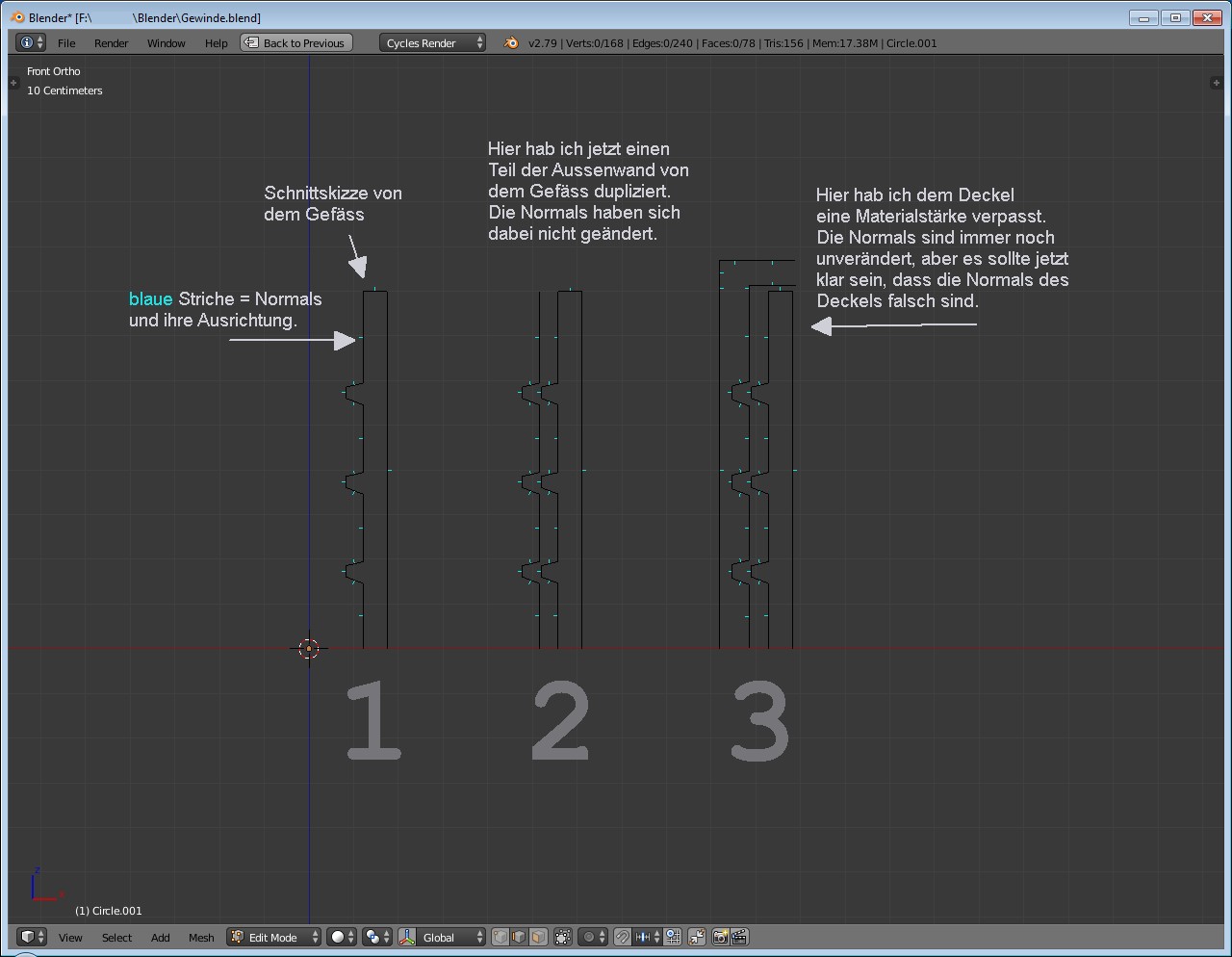 Tun sie ja auch. Du solltest aber bedenken, dass in Deinem Fall zwei Objekte zusammen kommen. Und wenn eines davon aus dem anderen abgeleitet wird, dann sind die Normals beim abgeleiteten Objekt zunächst einmal Falsch, weil aus den Aussenseiten bei der Ableitung Innenseiten werden. Also: Wenn Du den Deckel durch duplizieren erstellst, so wie Artoo es gezeigt hat, dann weisen die Normals des Deckels zunächst einmal in den Deckel hinein, weil der ja eine Kopie der Gefässwand ist. Wenn Du die Normals des Deckel dann flippst, zeigen sie wieder in die richtige Richtung.