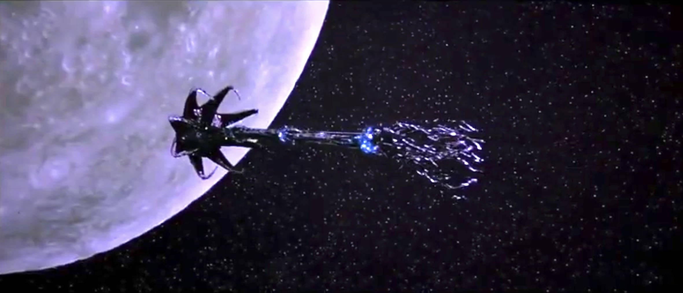 Ironischerweise ist das Schiff selber in dem Lichtspiel nicht wirklich oft zu sehen. Aber ich finde, dass sein Äußeres recht ungewöhnlich ist für das SF-Genre: Fledermausflügel als Sonnensegel, Aderstrukturen als Außenhülle ... sieht man selten.
