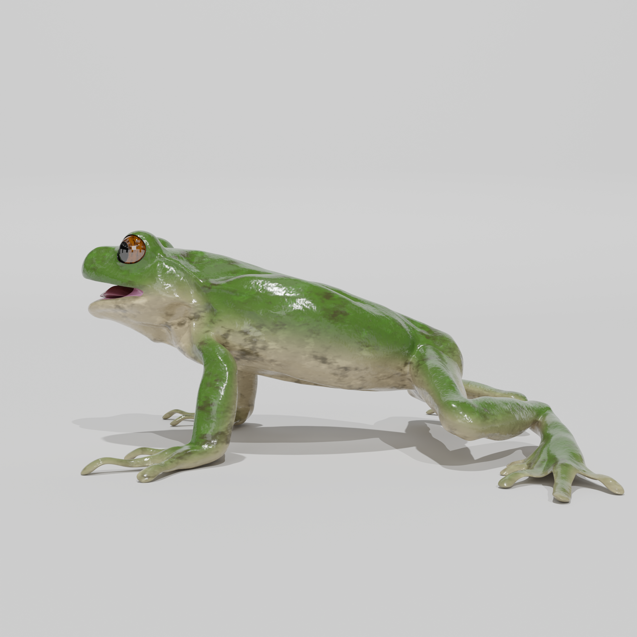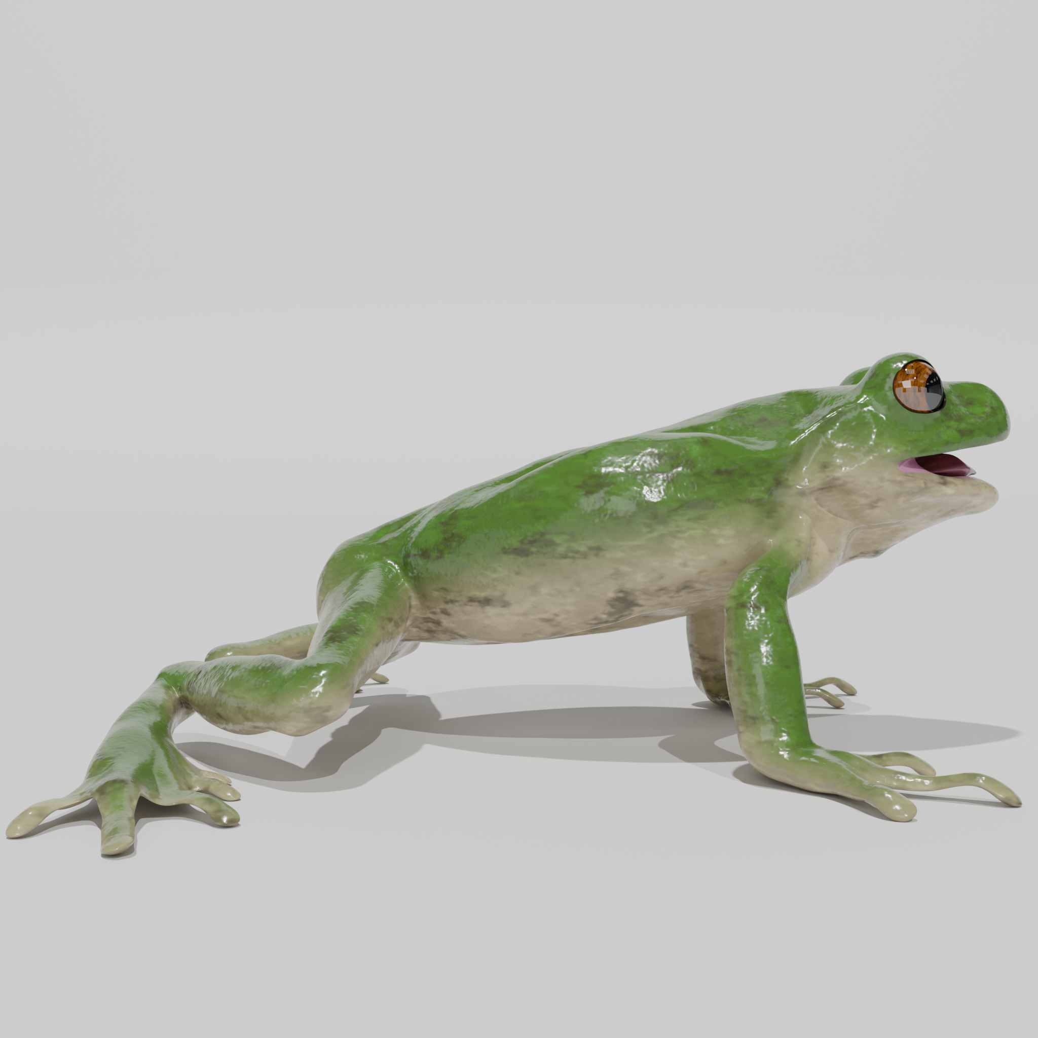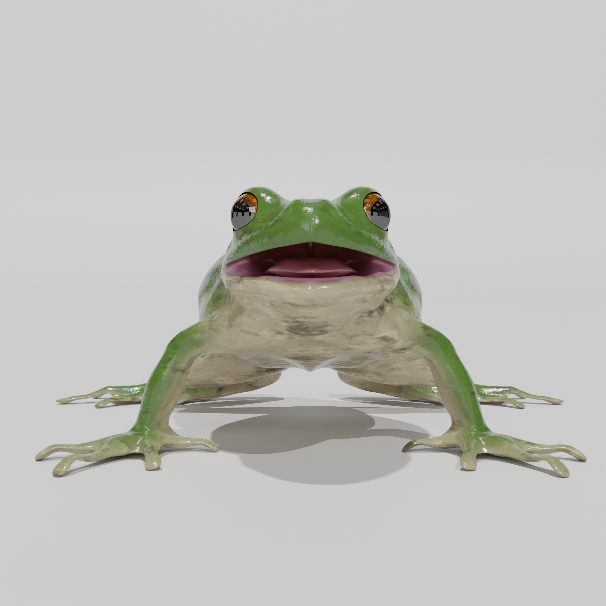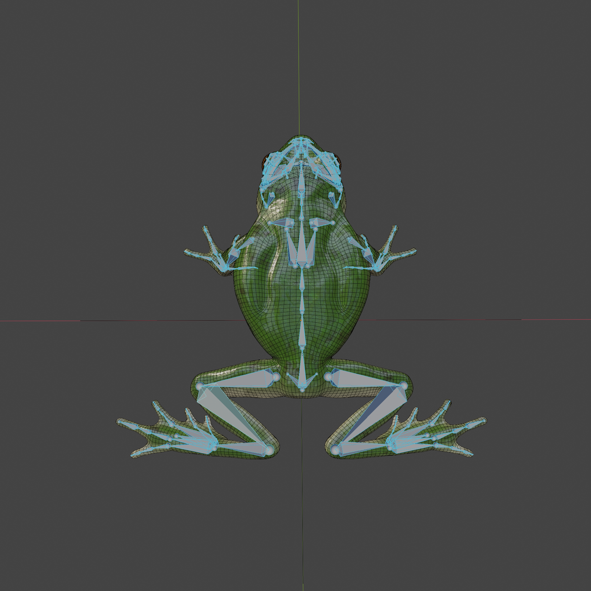 Ich habe das face rig noch wesendlich vereinfacht da frösche nicht blinzeln oder runzeln können die haben anstelle ser augenlieder nur eine so genante Nickhaut also eine membran die sich seitlich vor das auge schieben kann und im wesendlichen transperent ist. allso weg mit den unnötigen knochen und starre augenhölen gewichtet. aber zunge, augen, nase, lippen und ein zentraler face bone sind noch da. ich lade den Frosch gleich mal hoch ich muss nur noch zippen.