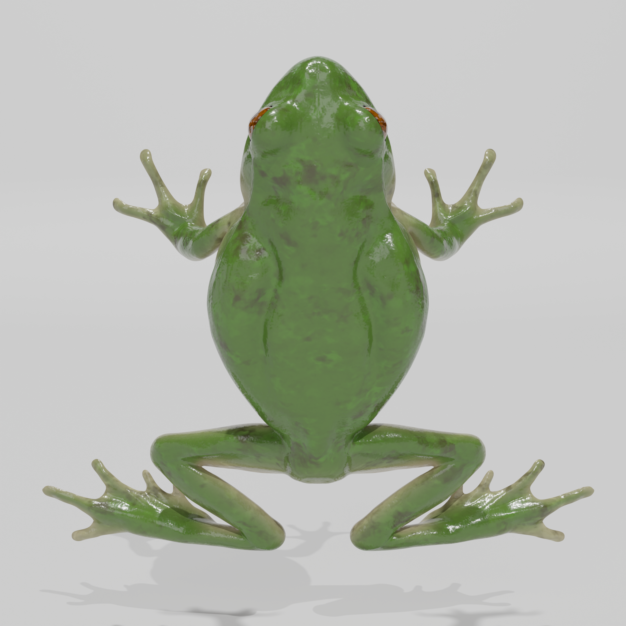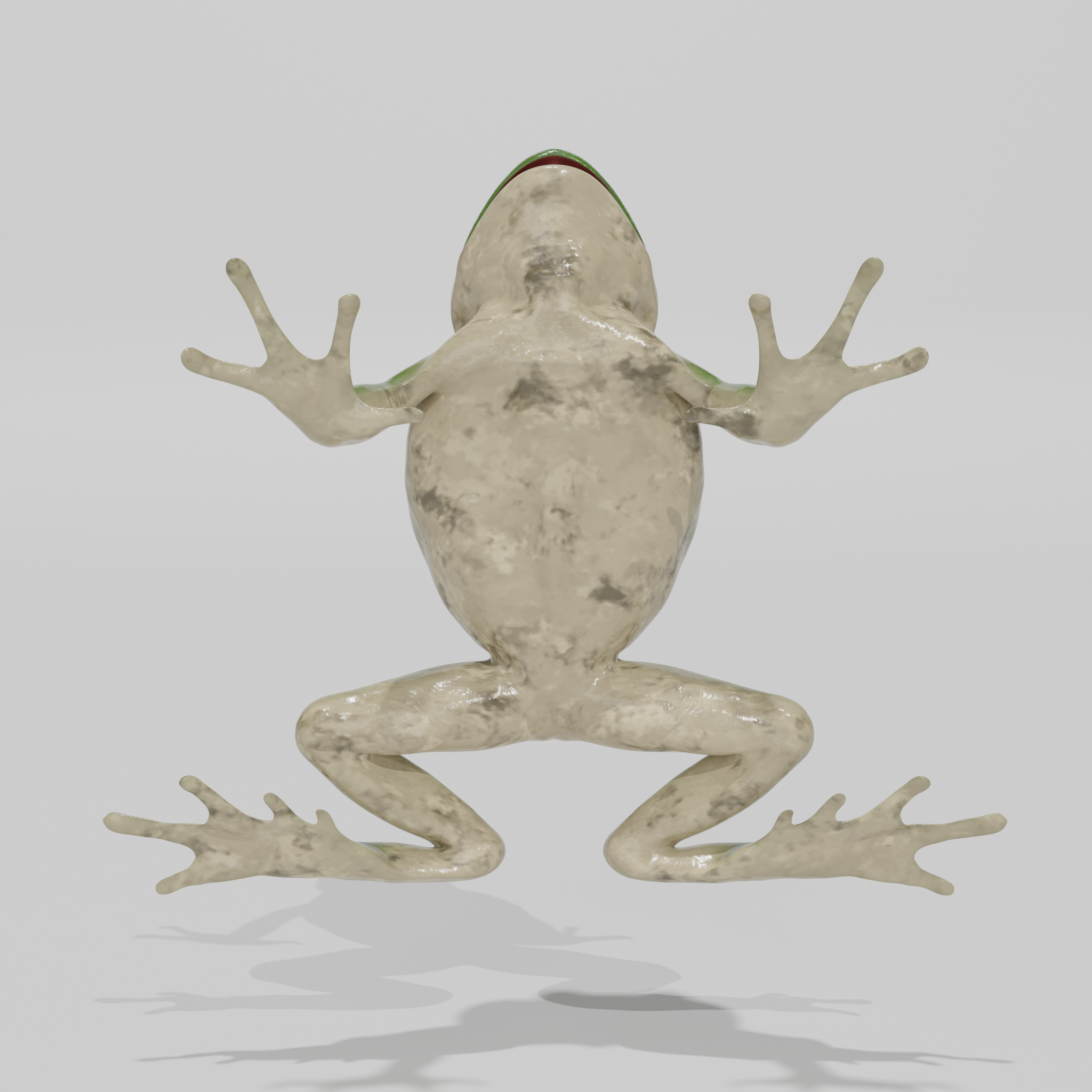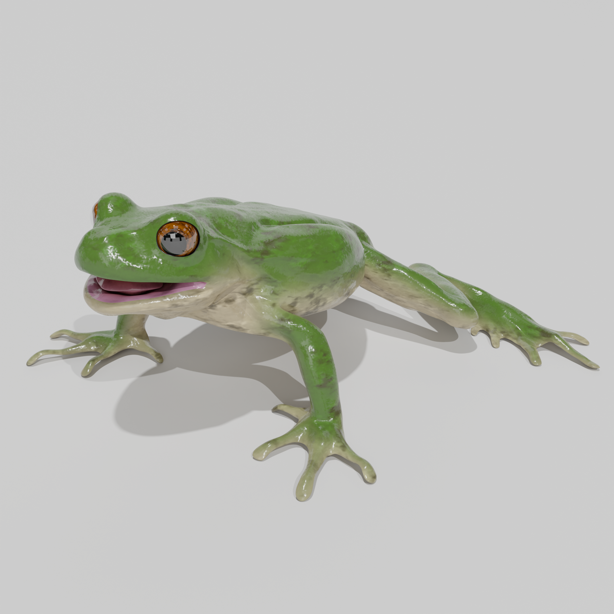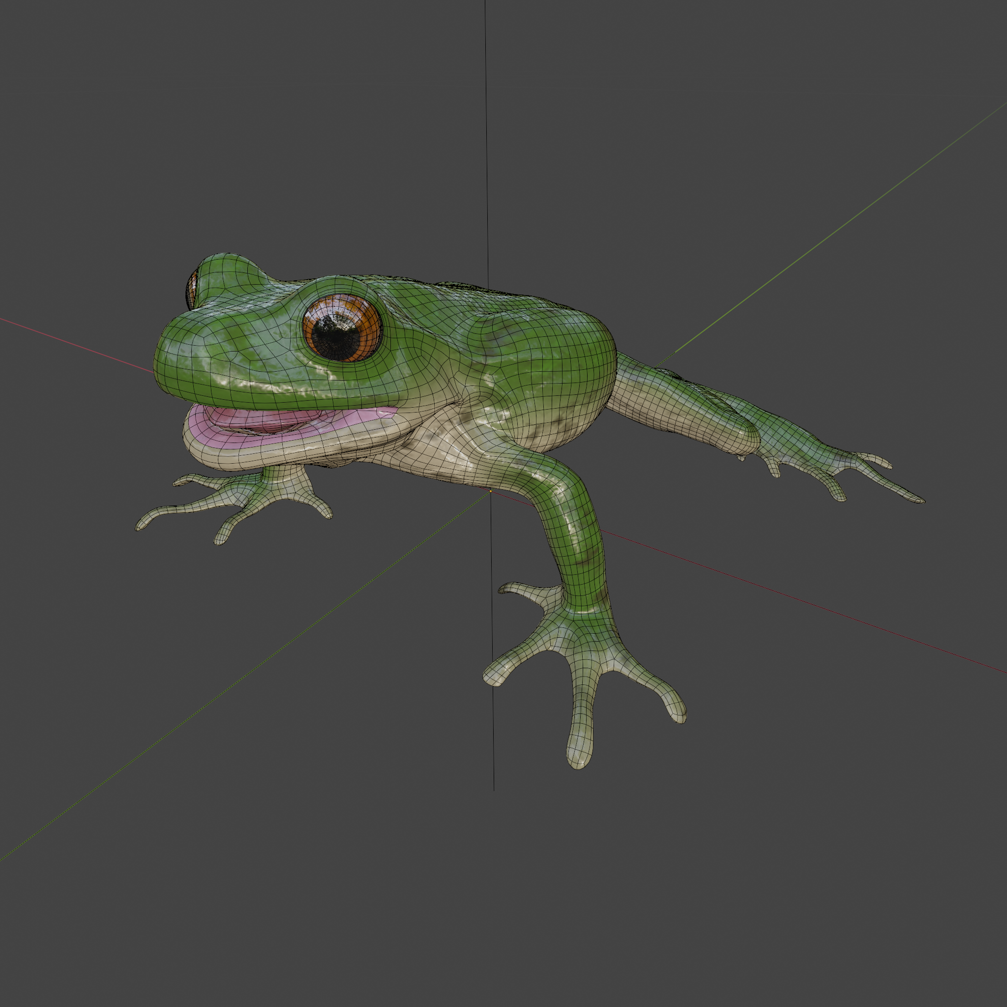 Ich habe das face rig noch wesendlich vereinfacht da frösche nicht blinzeln oder runzeln können die haben anstelle ser augenlieder nur eine so genante Nickhaut also eine membran die sich seitlich vor das auge schieben kann und im wesendlichen transperent ist. allso weg mit den unnötigen knochen und starre augenhölen gewichtet. aber zunge, augen, nase, lippen und ein zentraler face bone sind noch da. ich lade den Frosch gleich mal hoch ich muss nur noch zippen.