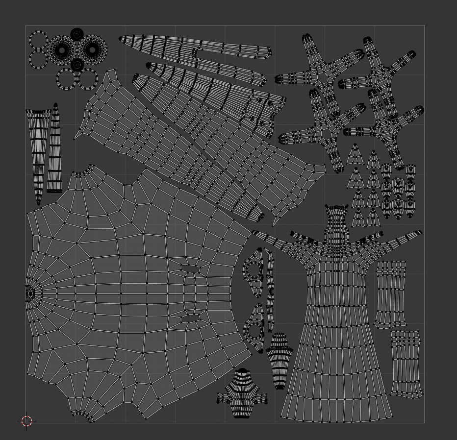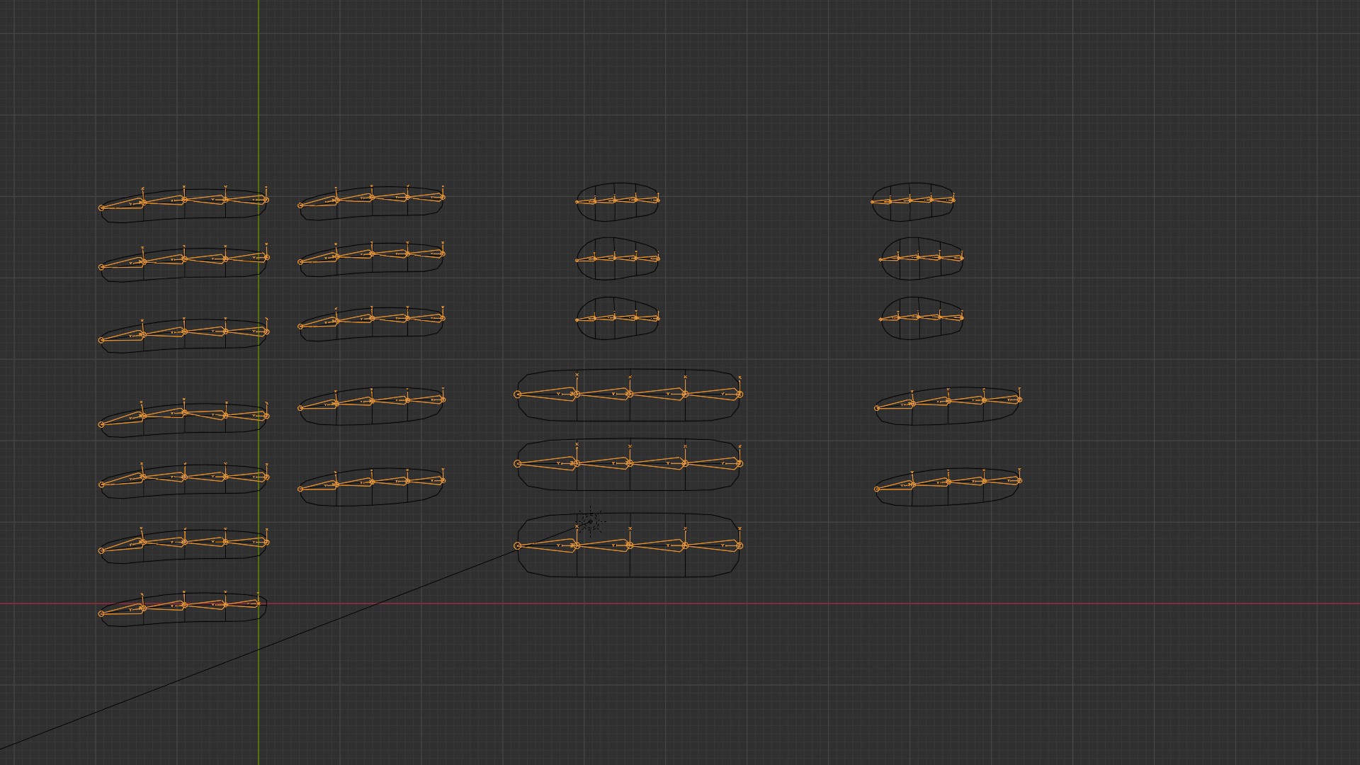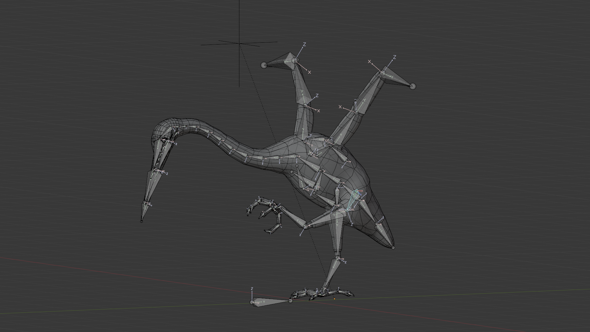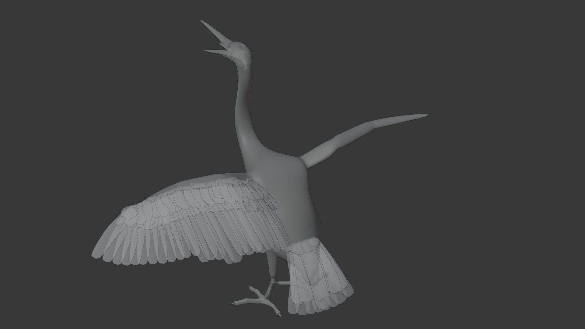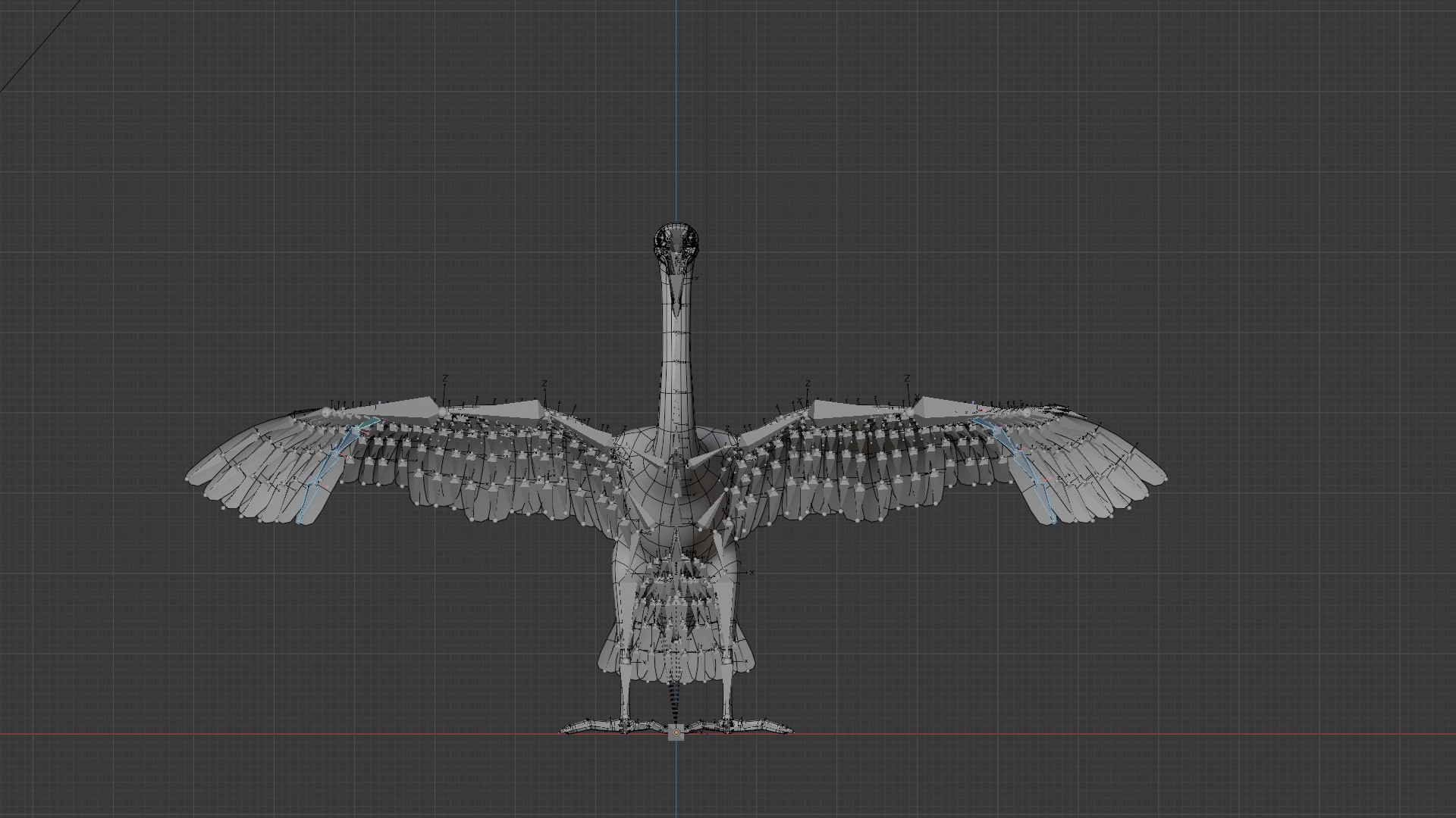 Federn+Bones auf dem Bürzel und einem Flügel verteilt und dann gespiegelt, jede Feder an ihre Armature geparentet (einzeln war besser, weil es da keine Weightüberschneidungen gab) und diese dann an den jeweilig zuständigen Flügel-Bones geparentet.