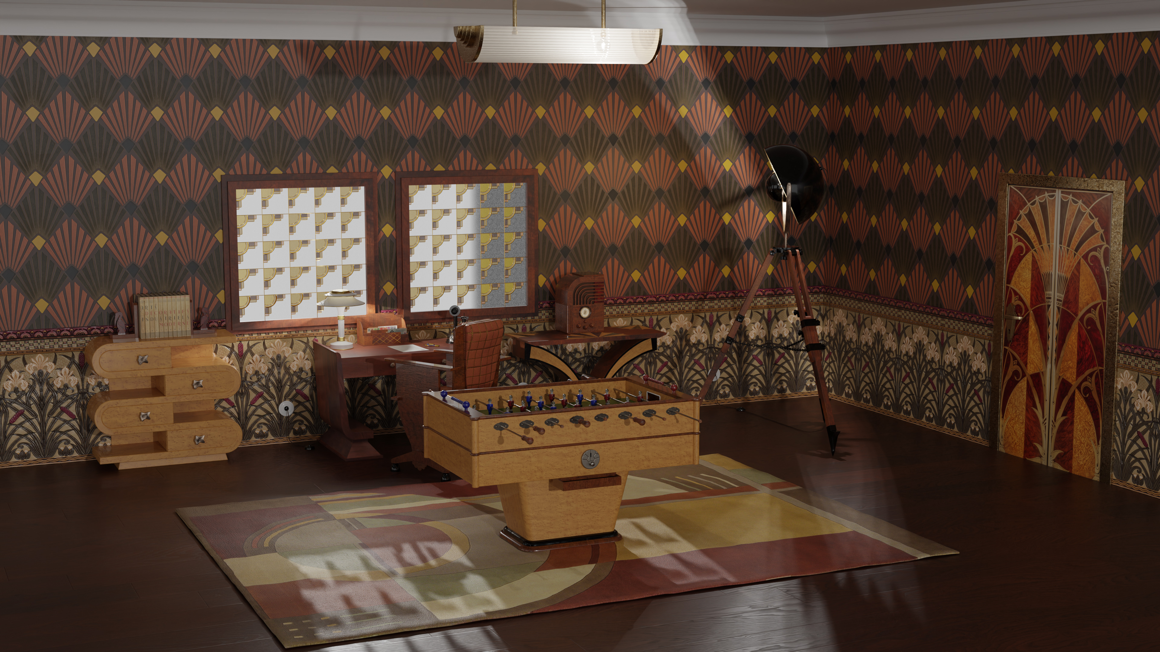 Korrespondenz aus den 1930er Jahren: Eine Reise in die Welt des Art Déco. Tauchen Sie ein in die elegante Atmosphäre eines typischen Büros der 1930er Jahre. Diese detaillierte Blender-Szene fängt den Geist des Art Déco perfekt ein, einer Ära, die für ihre Raffinesse, ihren technologischen Fortschritt und ihre künstlerische Innovation bekannt ist. Historischer Hintergrund: Art Déco (ca. 1920–1935): Der aus Frankreich stammende Art Déco-Stil beeinflusste Design, Architektur, Mode und Kunst weltweit. Er zeichnet sich durch geometrische Formen, luxuriöse Materialien und eine Vorliebe für Eleganz und Funktionalität aus. Füllfederhalter: In den 1930er Jahren erlebte der Füllfederhalter ein goldenes Zeitalter. Er war nicht nur ein praktisches Schreibgerät, sondern auch ein Statussymbol und Ausdruck des persönlichen Stils. Tischfußball: Tischfußball, auch als Foosball oder Tischfußball bekannt, wurde in den 1930er Jahren erfunden und wurde schnell als Freizeitbeschäftigung beliebt. Radio: Das „Zenith Model 811 Art Deco Tombstone Radio“ ist ein ikonisches Beispiel für das Radiodesign der 1930er Jahre. Radios waren zu dieser Zeit ein zentraler Bestandteil des gesellschaftlichen Lebens und dienten als Quelle der Unterhaltung und Information. Besonderheiten: Interaktive Elemente: Die Wände können heruntergeklappt werden, um die Kamerapositionierung zu erleichtern. Fenster und Türrahmen sind über Nullobjekte steuerbar und können in der Größe verändert werden. Authentische Details: Die Szene enthält zahlreiche authentische Details wie eine zeitgenössische Lampe, einen Füllfederhalter, ein Telefon, einen Briefhalter und einen Tischfußball. Hochwertige Materialien: Die Texturen und Materialien sind hochwertig und realistisch gestaltet, darunter Bakelit und Keramik für Schalter und Steckdosen sowie brauner Stoff für die Kabel. Flexibles Design: Alle Objekte können individuell angeordnet oder für eigene Projekte verwendet werden.