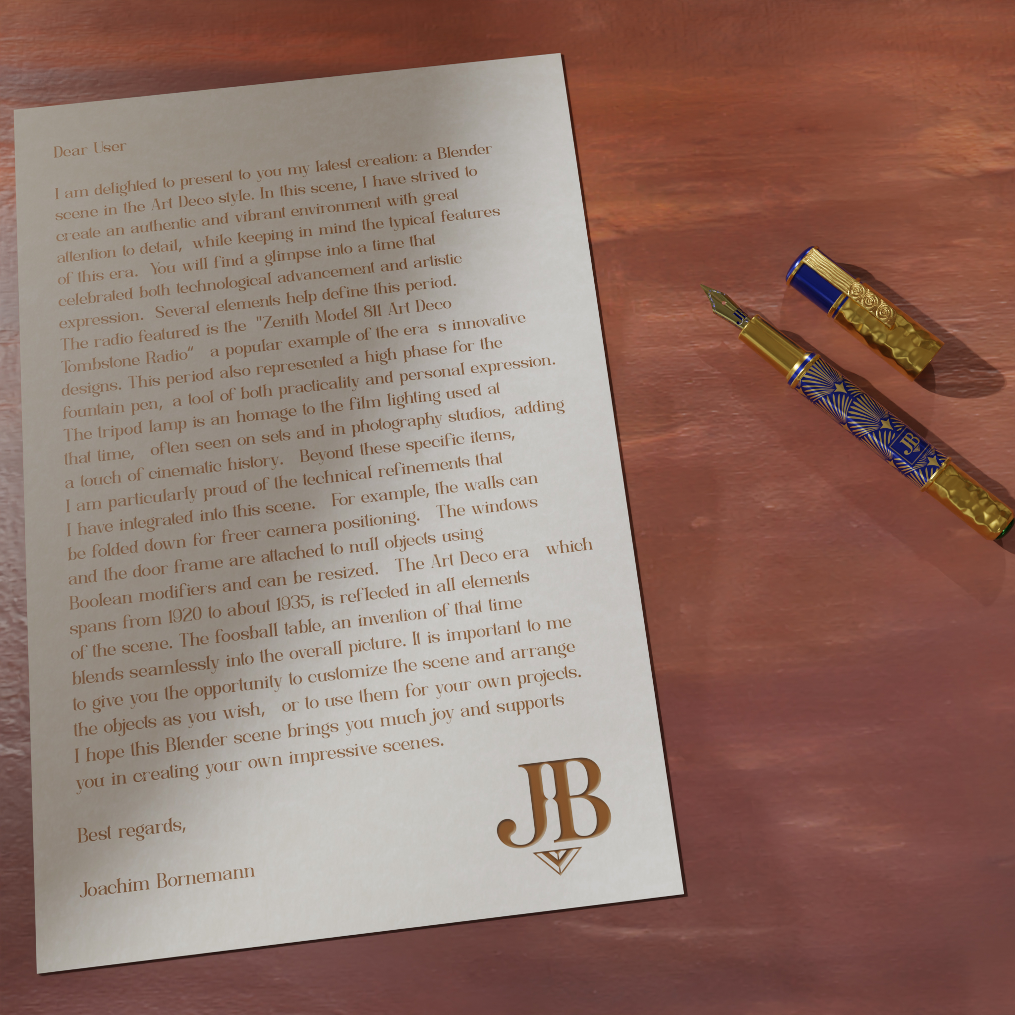 Korrespondenz aus den 1930er Jahren: Eine Reise in die Welt des Art Déco. Tauchen Sie ein in die elegante Atmosphäre eines typischen Büros der 1930er Jahre. Diese detaillierte Blender-Szene fängt den Geist des Art Déco perfekt ein, einer Ära, die für ihre Raffinesse, ihren technologischen Fortschritt und ihre künstlerische Innovation bekannt ist. Historischer Hintergrund: Art Déco (ca. 1920–1935): Der aus Frankreich stammende Art Déco-Stil beeinflusste Design, Architektur, Mode und Kunst weltweit. Er zeichnet sich durch geometrische Formen, luxuriöse Materialien und eine Vorliebe für Eleganz und Funktionalität aus. Füllfederhalter: In den 1930er Jahren erlebte der Füllfederhalter ein goldenes Zeitalter. Er war nicht nur ein praktisches Schreibgerät, sondern auch ein Statussymbol und Ausdruck des persönlichen Stils. Tischfußball: Tischfußball, auch als Foosball oder Tischfußball bekannt, wurde in den 1930er Jahren erfunden und wurde schnell als Freizeitbeschäftigung beliebt. Radio: Das „Zenith Model 811 Art Deco Tombstone Radio“ ist ein ikonisches Beispiel für das Radiodesign der 1930er Jahre. Radios waren zu dieser Zeit ein zentraler Bestandteil des gesellschaftlichen Lebens und dienten als Quelle der Unterhaltung und Information. Besonderheiten: Interaktive Elemente: Die Wände können heruntergeklappt werden, um die Kamerapositionierung zu erleichtern. Fenster und Türrahmen sind über Nullobjekte steuerbar und können in der Größe verändert werden. Authentische Details: Die Szene enthält zahlreiche authentische Details wie eine zeitgenössische Lampe, einen Füllfederhalter, ein Telefon, einen Briefhalter und einen Tischfußball. Hochwertige Materialien: Die Texturen und Materialien sind hochwertig und realistisch gestaltet, darunter Bakelit und Keramik für Schalter und Steckdosen sowie brauner Stoff für die Kabel. Flexibles Design: Alle Objekte können individuell angeordnet oder für eigene Projekte verwendet werden.