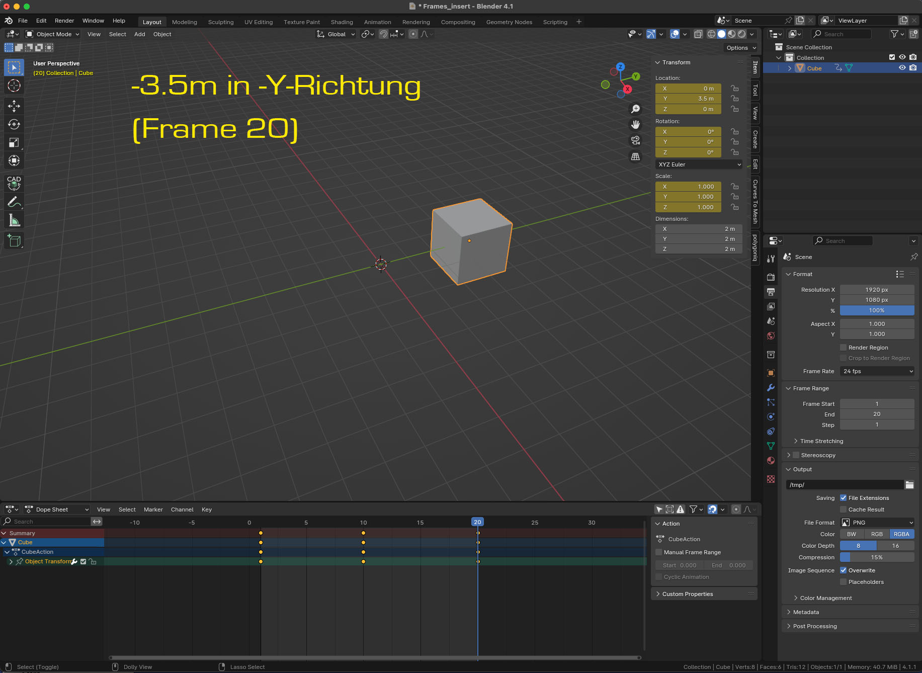 Wie in den angefügten Screenshots ersichtlich, habe ich eine einfache Szene mit einem Cube und in der Timeline eine Animation von 20 Frames erstellt.