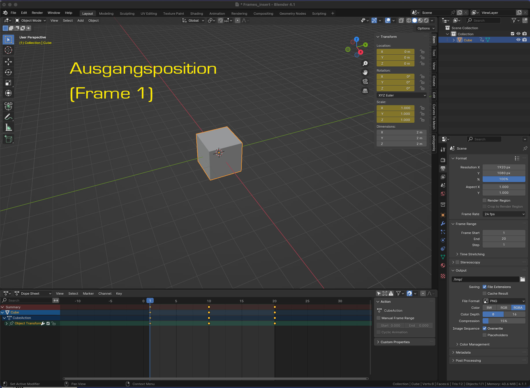 Wie in den angefügten Screenshots ersichtlich, habe ich eine einfache Szene mit einem Cube und in der Timeline eine Animation von 20 Frames erstellt.