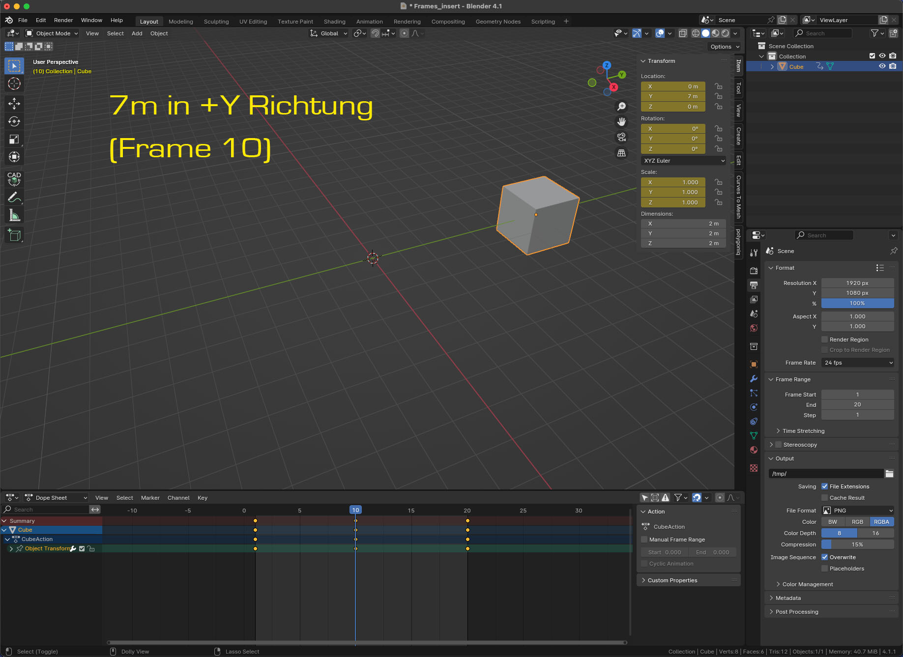 Wie kann ich für den den Bereich zwischen Frame 0 bis 10 (also 7m Bewegung nach +Y) zusätzliche 10 Frames einfüge, sodass die Bewegung vorwärts gleich schnell ist wie rückwärts?