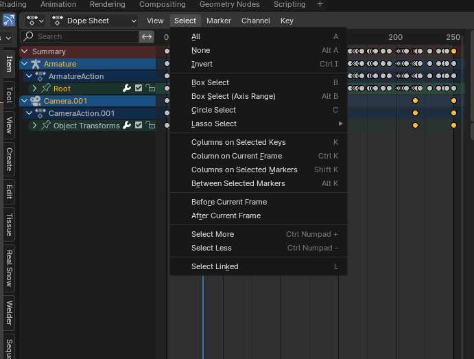 • Im Dope Sheet gibt es allerdings ein umfangreiches Select Menü,