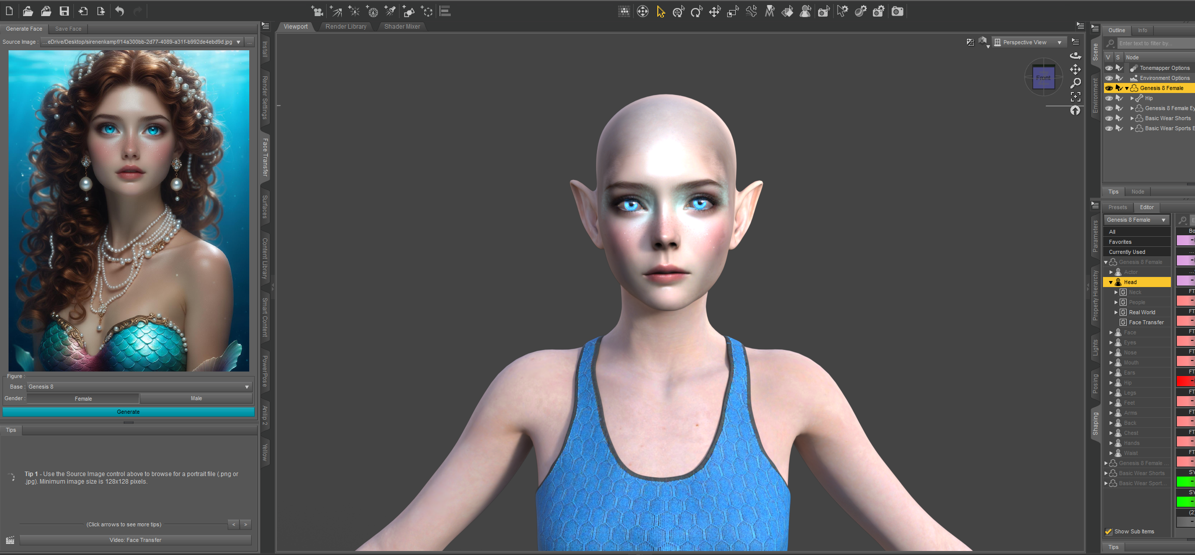 als erstes gehe ich zu Daz 3D und fange an eine Meerjungfrau zu gestalten mit Face Transfer und einer generierten Gesichtsvorlage (auch bei Luma Dream Machine)