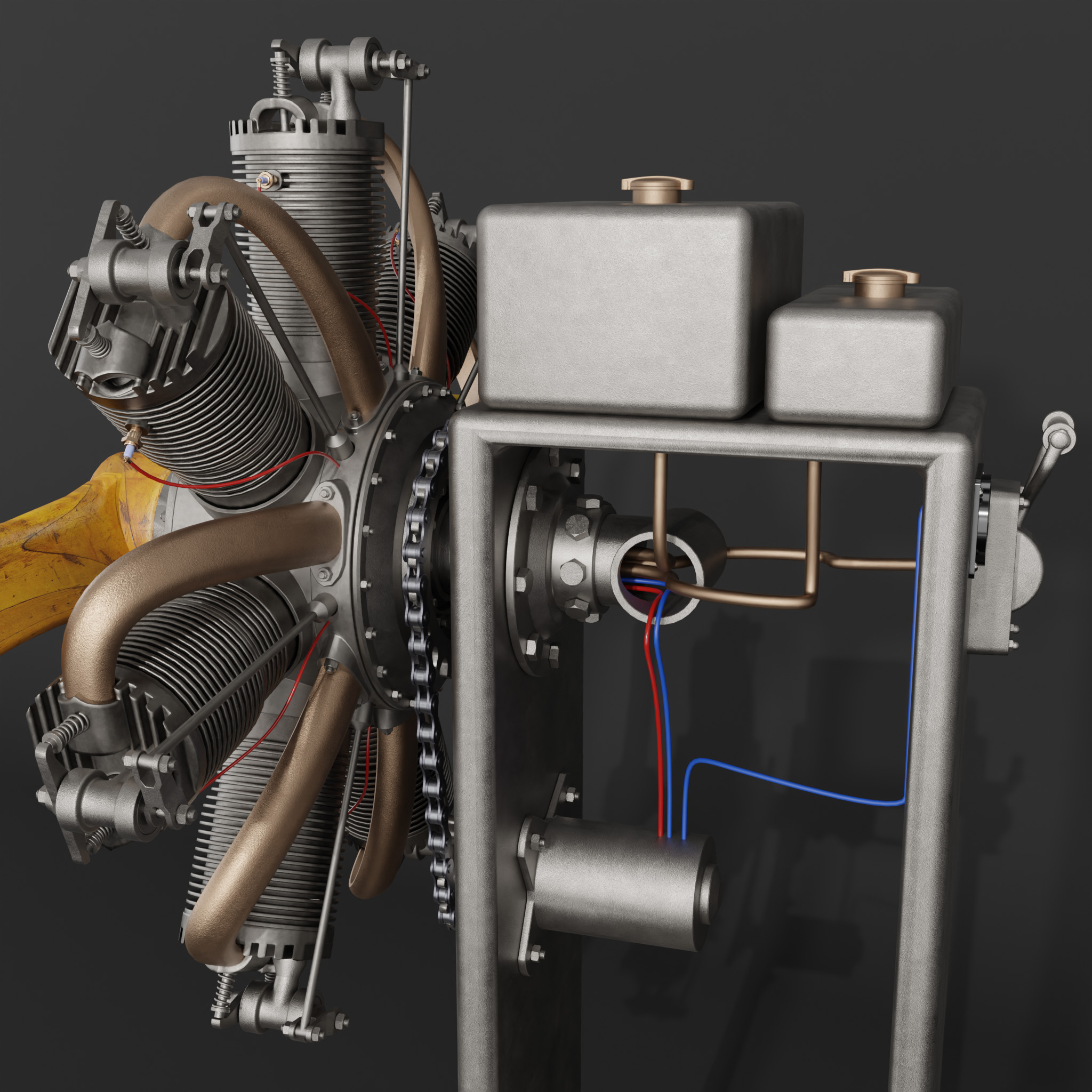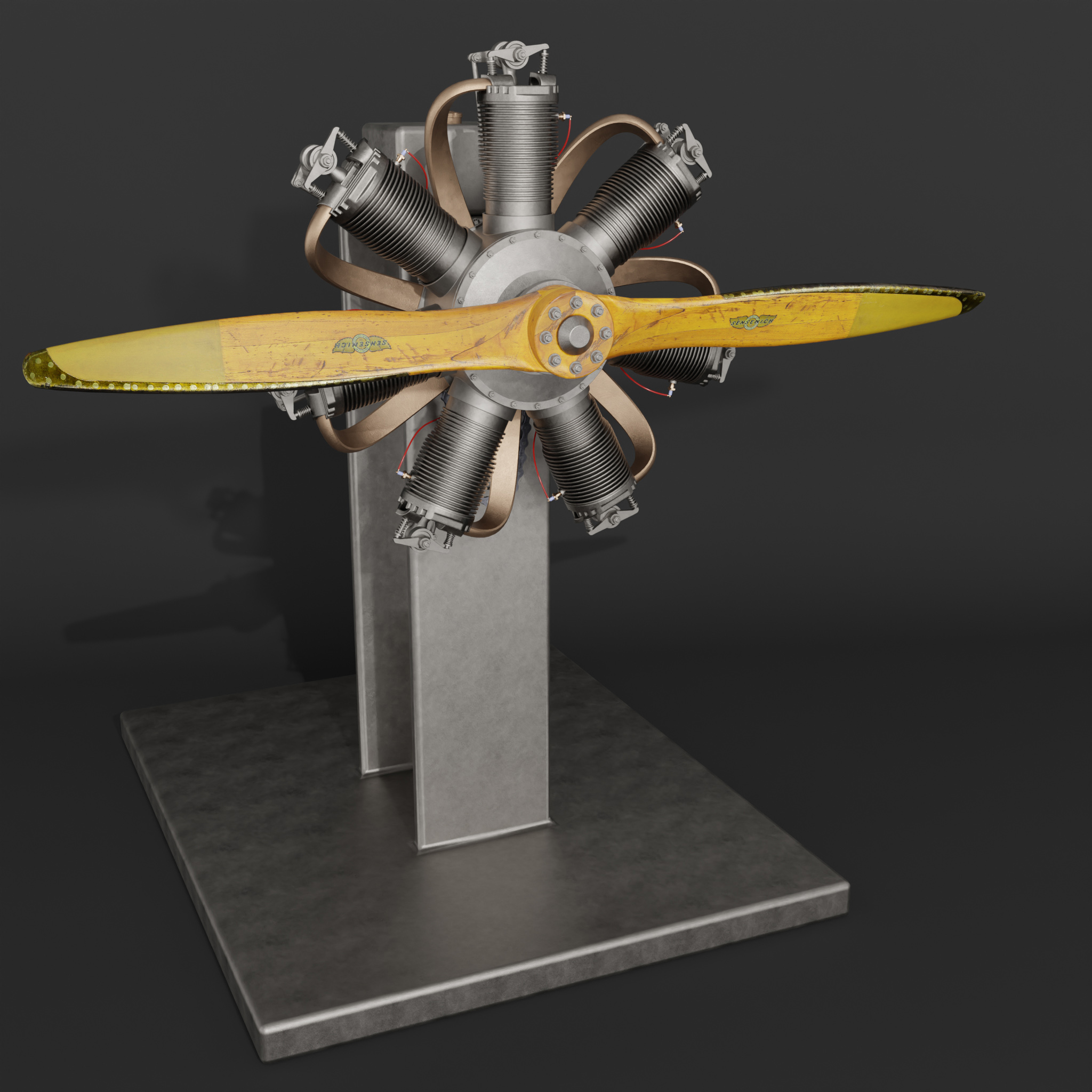 Dies ist ein sorgfältig gefertigtes Blender 4.4-Modell einer frühen Variante des legendären und preisgekrönten Gnome Omega 7-Zylinder-Wankelmotors, montiert auf einem Versuchsprüfstand. Diese besondere Version verfügt über das besondere Merkmal von zwei obenliegenden Ventilen pro Zylinder und einzelnen Ansaugkrümmern, ein Designmerkmal der früheren Serienmodelle. Die Gnome Omega-Motorenfamilie erreichte zwischen 1909 und 1915 bedeutende historische Meilensteine und trieb Flugzeuge zu zahlreichen Weltrekorden an, darunter das erste, das die Geschwindigkeitsgrenze von 100 km/h durchbrach. Motor-Spezifikationen (frühe 2-Ventil-Version): Typ: Wankelmotor, 7 Zylinder, 2 Ventile pro Zylinder, luftgekühlt, einzelne Ansaugkrümmer. Leistungsangabe: Typischerweise ca. 37 kW (50 PS) bei 1.200 U/min (kann je nach Untervariante leicht variieren). Hubraum: 7,98 Liter (488,5 Kubikzoll). Bohrung und Hub: 110 mm (4,33 Zoll) x 120 mm (4,73 Zoll). Gewicht: ca. 75 kg. Der frühe Gnome Omega mit seiner Zweiventil-Konfiguration stellte aufgrund der erheblichen Kreiselkräfte, die durch seine rotierende Masse (ca. 70 kg) erzeugt wurden, noch die besonderen Herausforderungen an die Handhabung von Wankelmotoren. Er bot jedoch eine bessere Zylinderkühlung als zeitgenössische Reihenmotoren. Die spätere „Monosoupape“-Version (mit einem Ventil) wurde als Weiterentwicklung entwickelt. Funktionen des Blender-Modells: Dieses Blender-Modell ist für Animationen vorbereitet. Drehen Sie einfach das zentrale Nullobjekt (den Ring), um die Bewegung des angeschlossenen Magnetzünders und des Kettenantriebs zu beobachten. Für die präzise Manipulation einzelner Komponenten wird dringend empfohlen, die Transformationsausrichtung „Lokal“ in Blender zu verwenden, da das Modell bewegliche Teile und Animationsabhängigkeiten enthält. Ich hoffe, Sie haben Spaß an der Arbeit mit dieser historisch bedeutsamen frühen Variante des Gnome Omega-Motors und hoffen, dass sie Ihre kreativen Szenen bereichert.