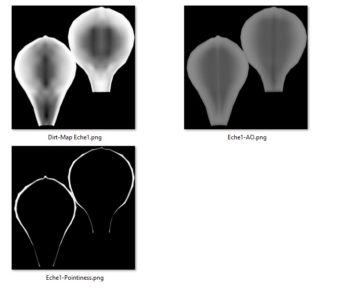 Im schwarzen Frame links oben sind die Grundlagen der drei Maps, die gebacken wurden, zu sehen. Das hebe ich auf, um das bei der nächsten Pflanze wieder verwenden zu können, falls die Form zu stark von der jetztigen abweicht.