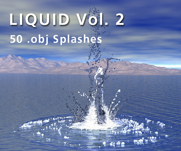 Bibliothek von 50 Flüssigkeitsformen in untexturiertem Obj Format. Die beste Wirkung wird mit prozeduralen Wasser- oder Glas-Shadern / -Materialien erzielt.
