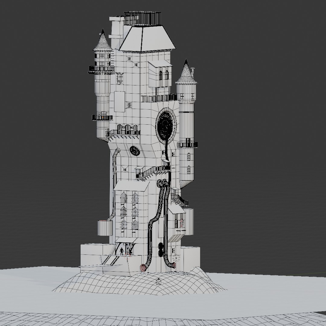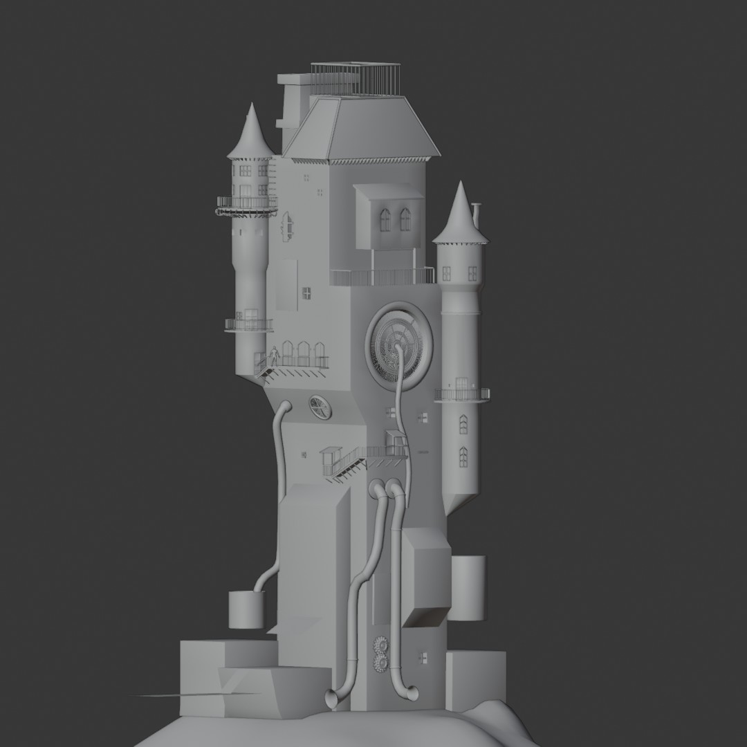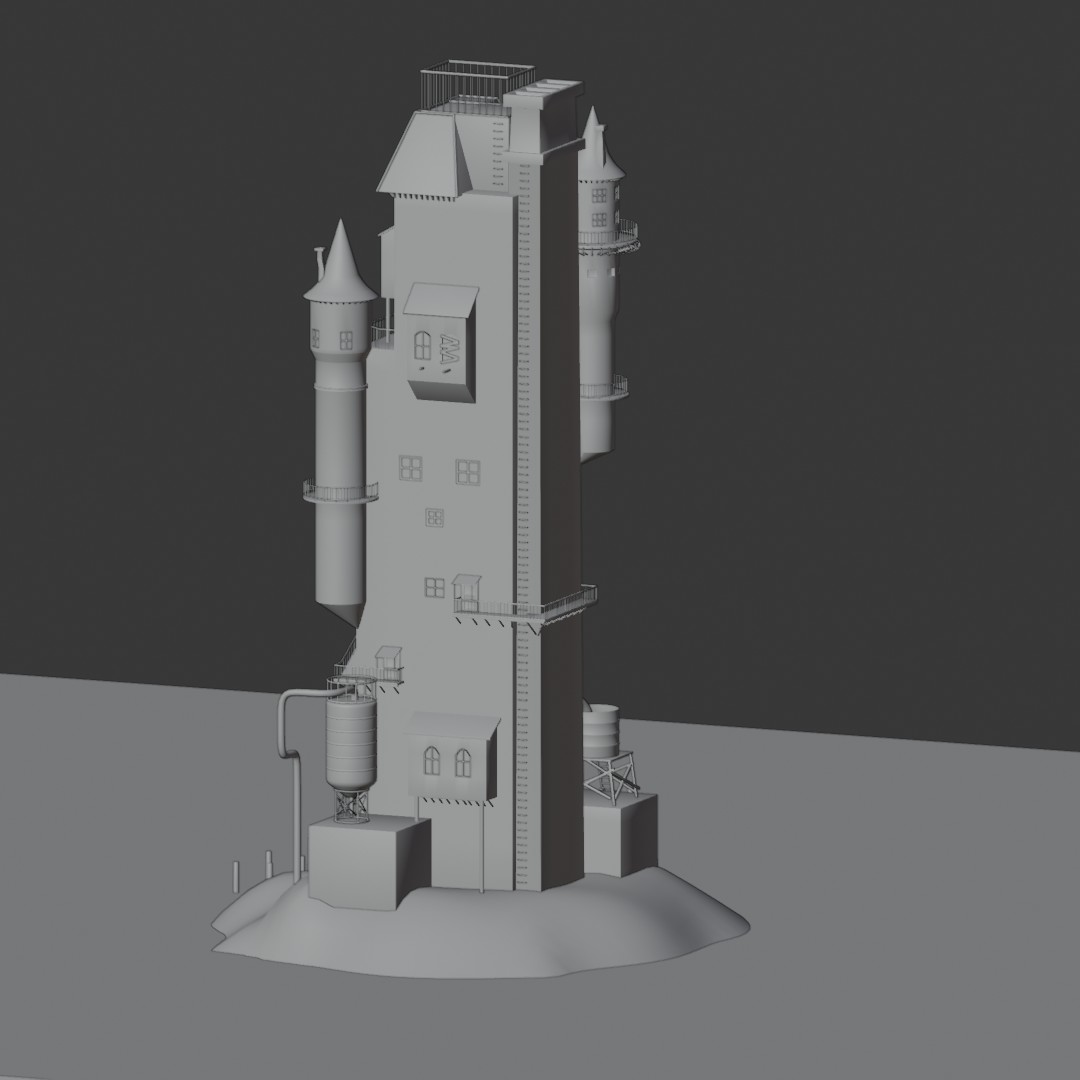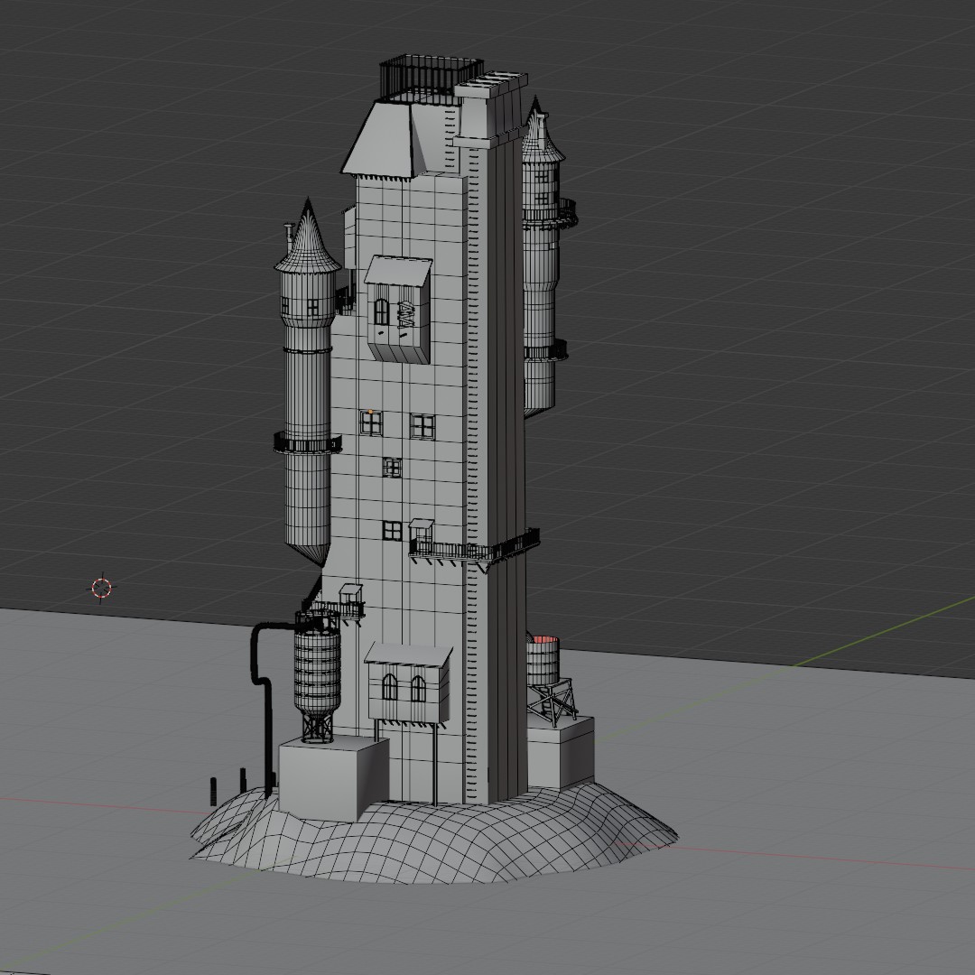 Ich habe beschlossen noch mal Häuslebau zu üben, kann nie schaden. Vorlage ist ein skurriles Teil von Pinterest. Läuft dort unter Steampunk Building und ist kein KI-Bild.