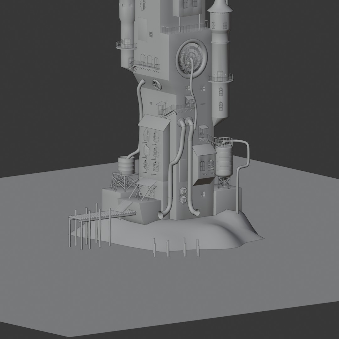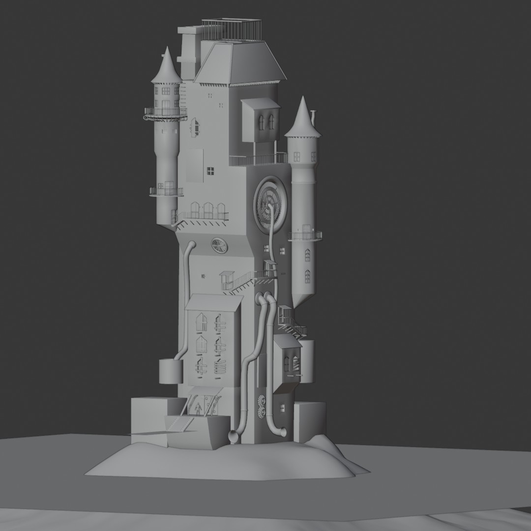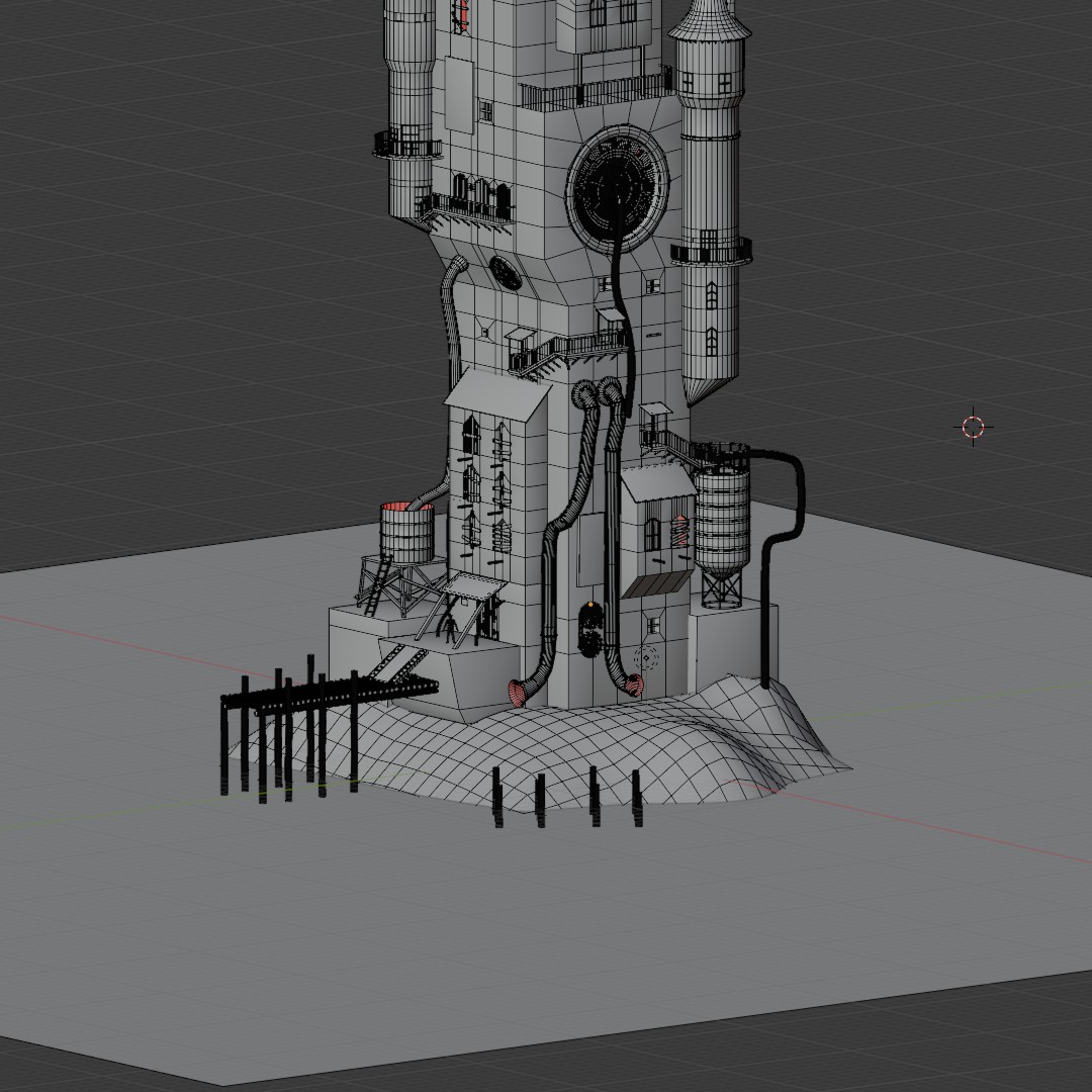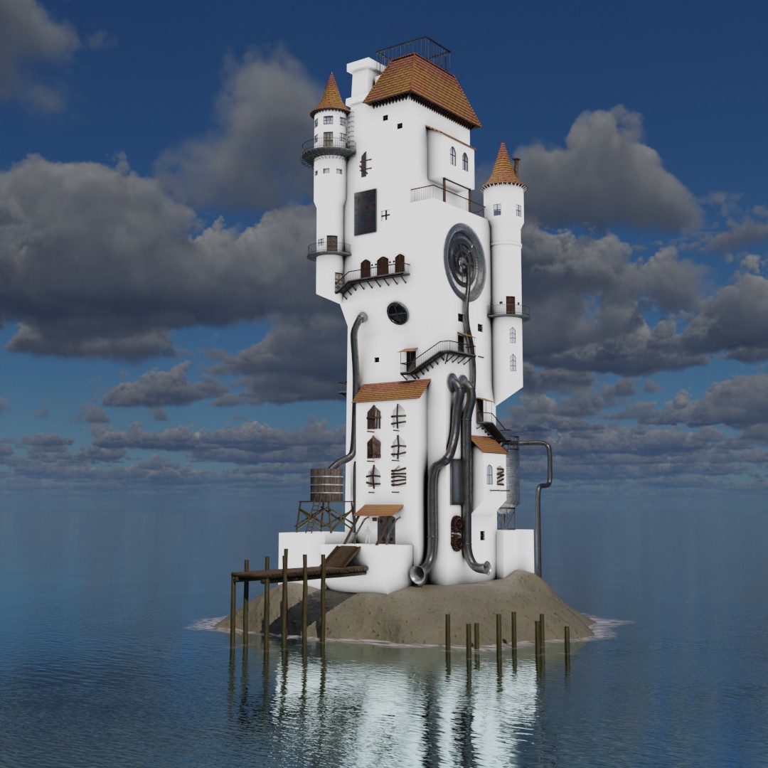 Ich habe beschlossen noch mal Häuslebau zu üben, kann nie schaden. Vorlage ist ein skurriles Teil von Pinterest. Läuft dort unter Steampunk Building und ist kein KI-Bild.