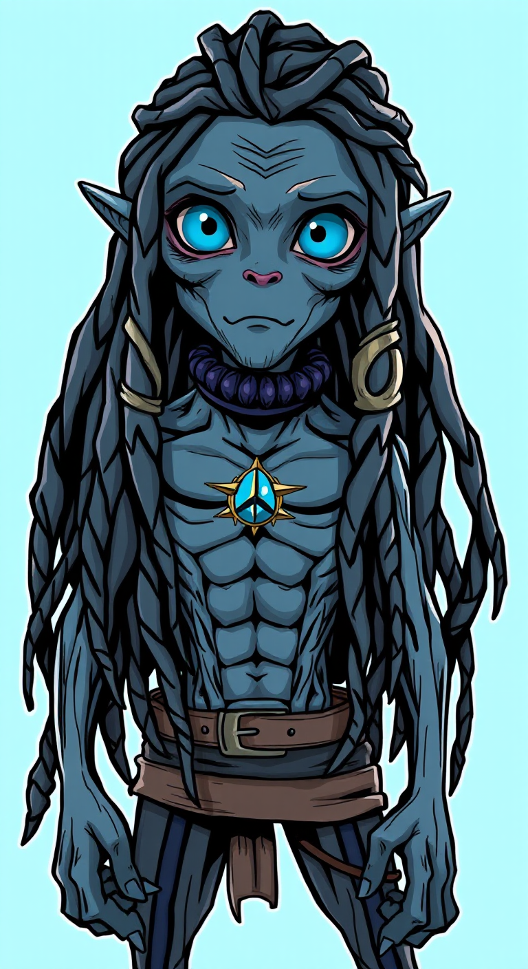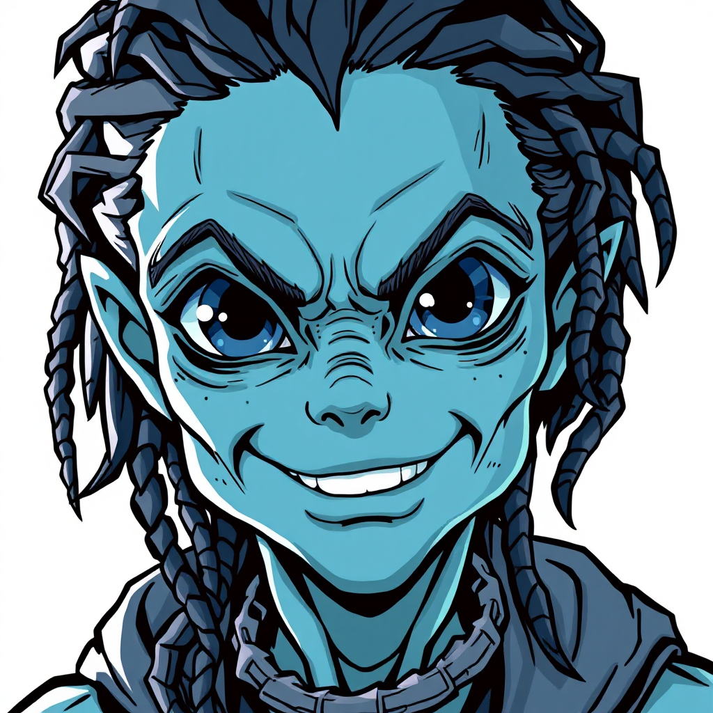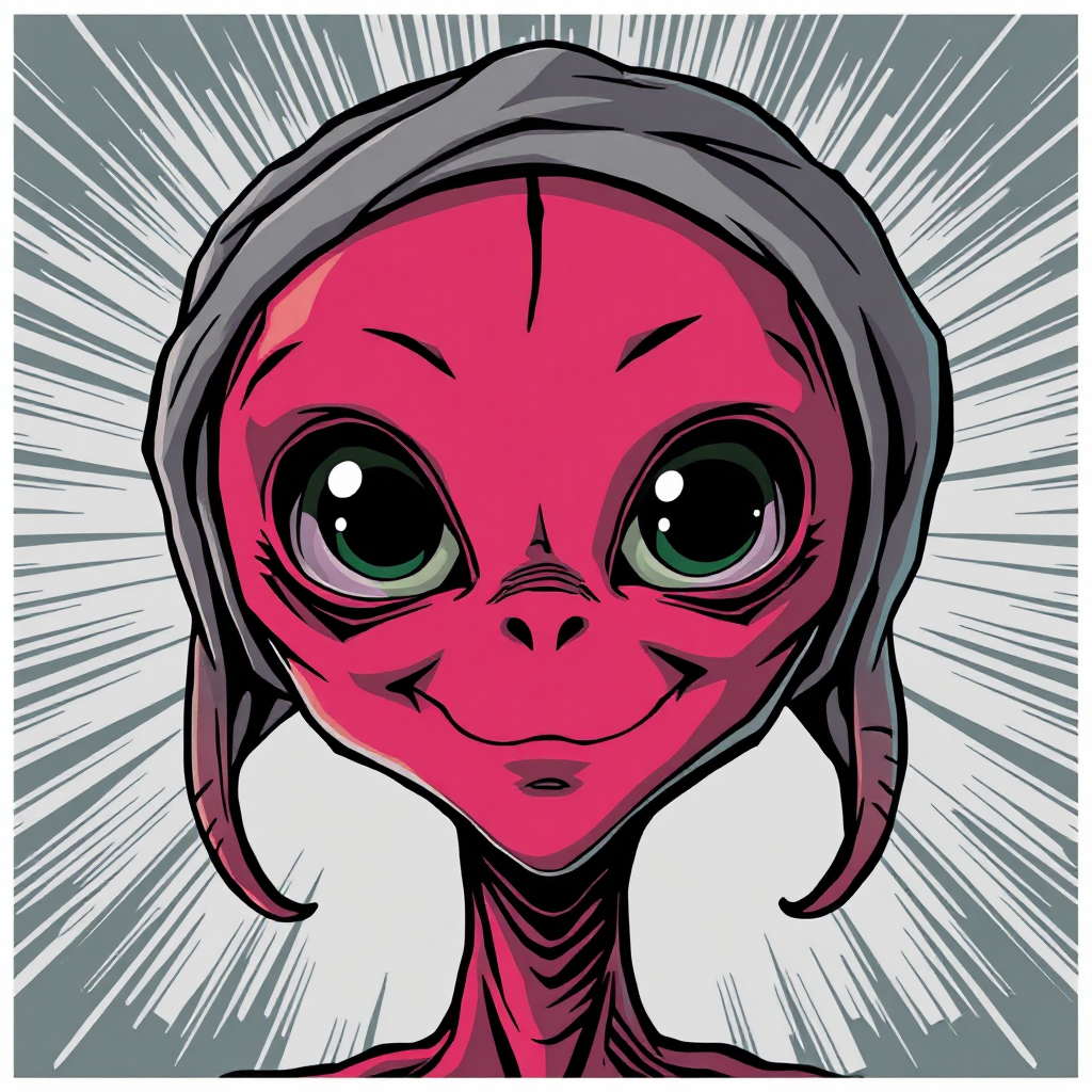 prompt: portrait of an alien, red and blue color scheme, smiling expression, large green eyes, cinematic lighting, 8k resolution, highly detailed texture, photorealistic rendering, depth of field effect. -