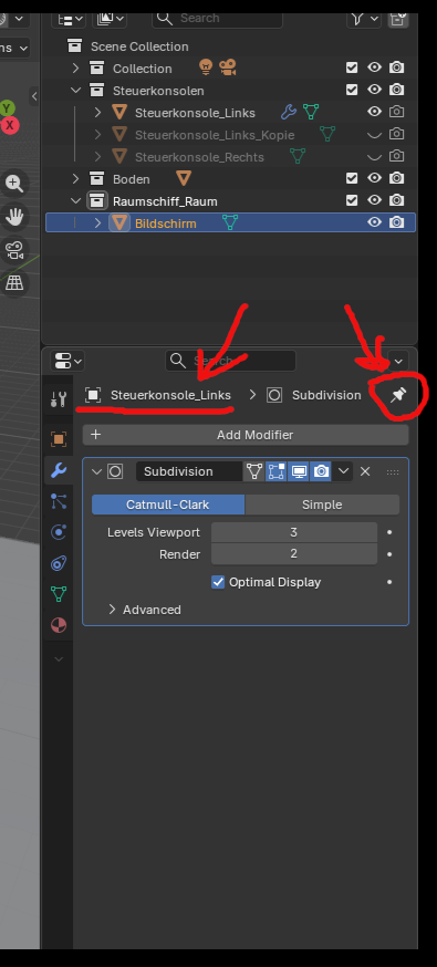 Das witzige (nein, witzig ist es eigentlich nicht) daran ist, dass ich bei ausgewähltem Bildschirm - also das riesen Teil hinter dem Steuerpult - den Subdivision Surface-Modifier eingesetzt habe und NICHT während ich das Steuerpult angewählt hatte. Soll das so sein, dass ein Modifier universell für alle Objekte auftaucht, sobald man einen setzt?? Denn genau das ist so, wenn ich alle Objekte nacheinander auswähle. Der Modifier verschwindet nicht, er bleibt in der Ansicht. In anderen Projektdateien ist es nicht so. :/