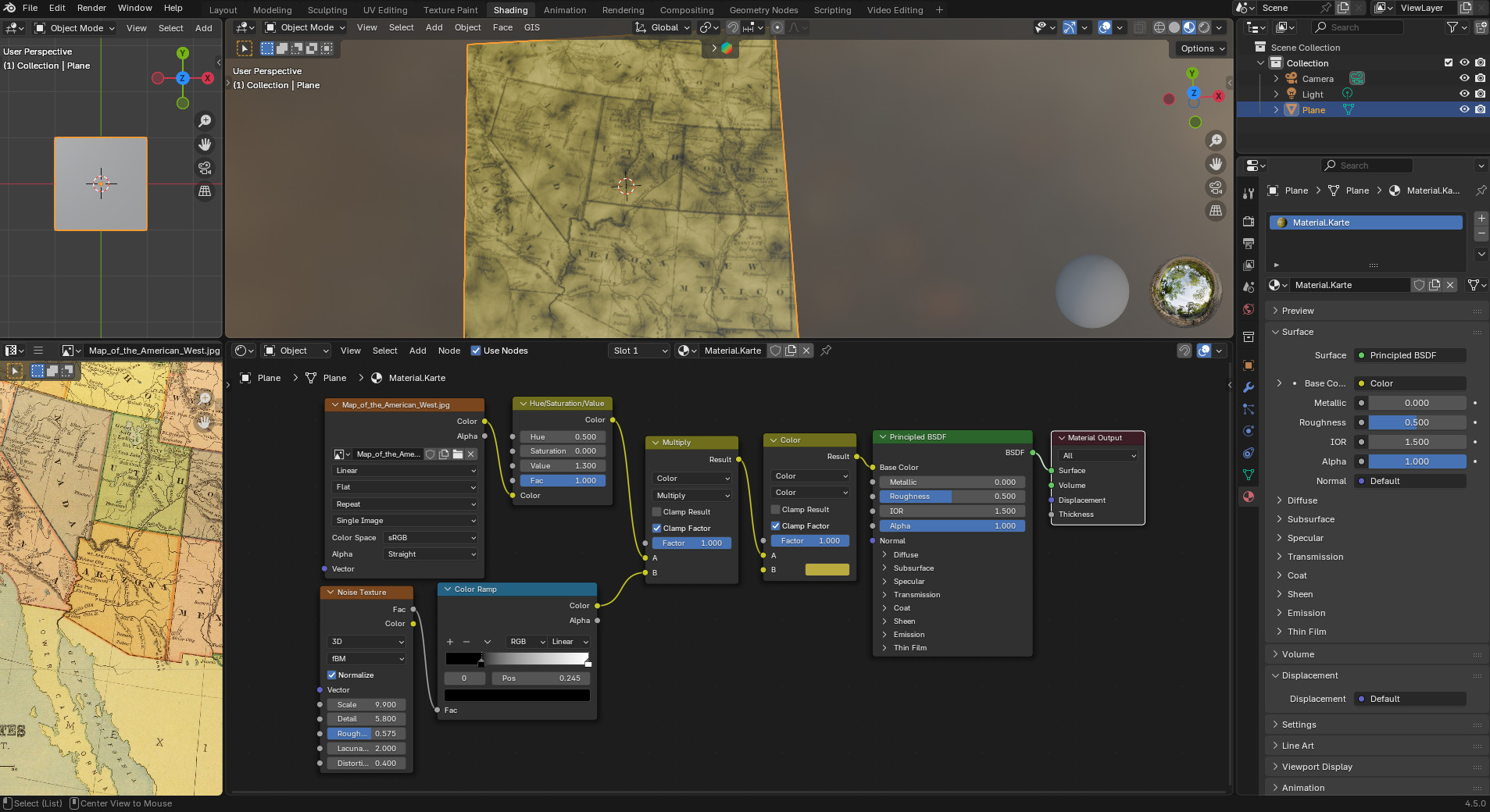 Hier ein einfaches Beispiel, wo ich eine einfach Karte (Quelle: Wiki Commons) auf eine Plane gemappt habe,