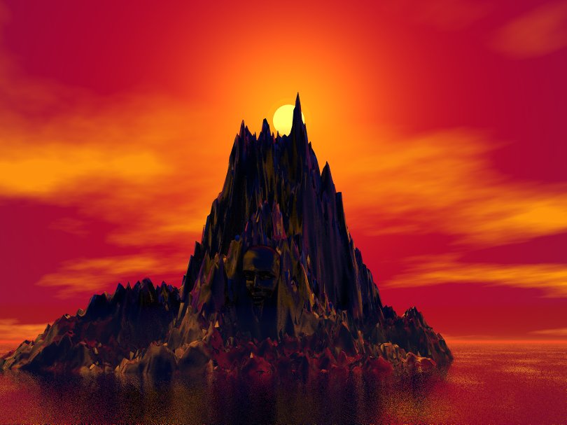 Ob du nun noch ein paar weitere Objekte platzierst (Land am Horizont oder so) liegt bei dir. Ich könnte mir so 'n kleines Schiffchen (Eingeborenenkanu - ) im Hintergrund vorstellen, in dem ein paar Eingeborene zur Insel rudern um ihre Opfergaben hin zu bringen.